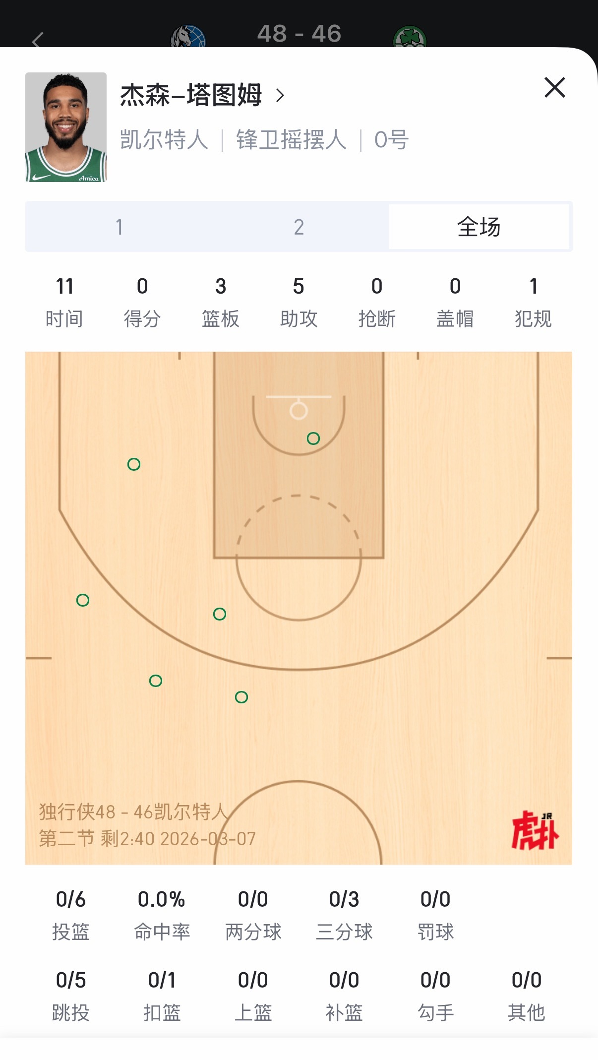 复出首战,塔图姆目前表现:0分3板5助,6中0。