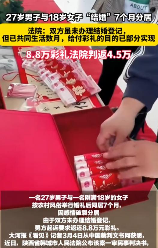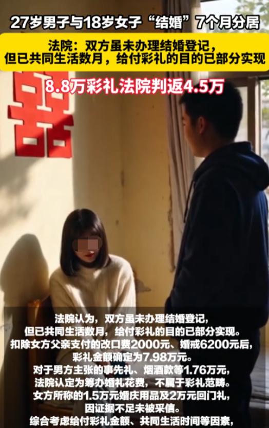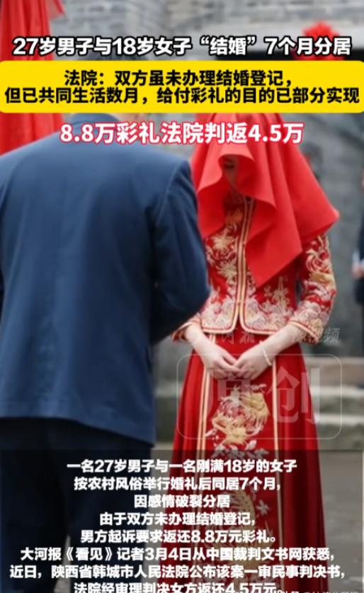 “这门婚事就不该同意!”陕西韩城,一18岁女子嫁给了27岁男子,谁知二人才同居7个月,女子就流产两次,男子因为没有稳定工作,日常开销都需要女子找娘家人要,也正因为如此,二人经常吵架,最终男子起诉了女子,要求其返还88000元的彩礼,可女子一分钱都不想退,她称结婚时陪嫁都有4万元,而因流产还产生的3万元费用,可法院的判决却让女子傻眼了。 陕西韩城的一场婚事,闹得人尽皆知,最后闹上法庭的结局,不仅让当事人措手不及,也让身边人看得唏嘘不已。 18岁的姑娘刚成年,经人介绍认识了27岁的小伙,双方没多了解就按农村风俗办了婚礼,没来得及领结婚证,毕竟姑娘还没到法定婚龄,谁也没料到,这场仓促的结合,会变成一场两败俱伤的闹剧。 两人刚在一起的头一个月,还能凑凑合合过日子,可没过多久,矛盾就彻底暴露出来。 小伙没有稳定工作,整天游手好闲,赚的钱连自己抽烟喝酒都不够,家里的柴米油盐、两人的日常用度,全靠姑娘厚着脸皮回娘家伸手要。 一次两次还好,次数多了,姑娘的娘家人难免有意见,姑娘自己也觉得抬不起头,两人的争吵也就成了家常便饭。 更让人揪心的是,同居没几个月,姑娘就怀孕了,本以为孩子能缓和两人的矛盾,没想到因为长期争吵、心情郁结,加上年纪太小身体还没完全发育好,没保住孩子,第一次流产了。 小伙不仅没多安慰,反而抱怨姑娘没用,连个孩子都保不住,两人的关系更是雪上加霜。 可命运似乎故意捉弄人,没过多久姑娘再次怀孕,这次她格外小心,可还是没能留住孩子,短短七个月里,两次流产,姑娘的身体和心理都遭受了不小的打击。 接连的打击和无休止的争吵,让这段关系彻底走到了尽头,两人分开后,谁也没料到,小伙会直接起诉姑娘,要求她返还当初给付的88000元彩礼。 姑娘得知消息后又气又委屈,她觉得自己没做错什么,当初结婚时家里给了4万元陪嫁,全花在了两人的共同生活里。 并且加上两次流产的营养费、医药费,前前后后也花了3万多,自己付出了这么多,凭什么还要返还彩礼,所以她一分钱都不想退。 姑娘本以为自己的理由足够充分,法院一定会站在自己这边,可最终的判决却让她彻底傻眼。 法院审理后认为,两人虽然按风俗举办了婚礼,但并未办理结婚登记,彩礼的给付目的没有完全实现,不过考虑到两人已经共同生活了七个月,姑娘也有两次流产的身体损耗,且部分彩礼已用于共同生活,并没有全额支持小伙的诉求。 最终法院判决姑娘返还小伙45000元彩礼,这个结果让姑娘难以接受,她觉得自己的付出没有得到应有的认可,可法律自有公断。 这场闹剧也给所有人提了个醒,婚姻不是儿戏,尤其是还没到法定婚龄的年轻人,切勿仓促结合,更不要忽视感情基础,否则不仅会伤害自己,也会牵扯到两个家庭,到头来只能得不偿失。