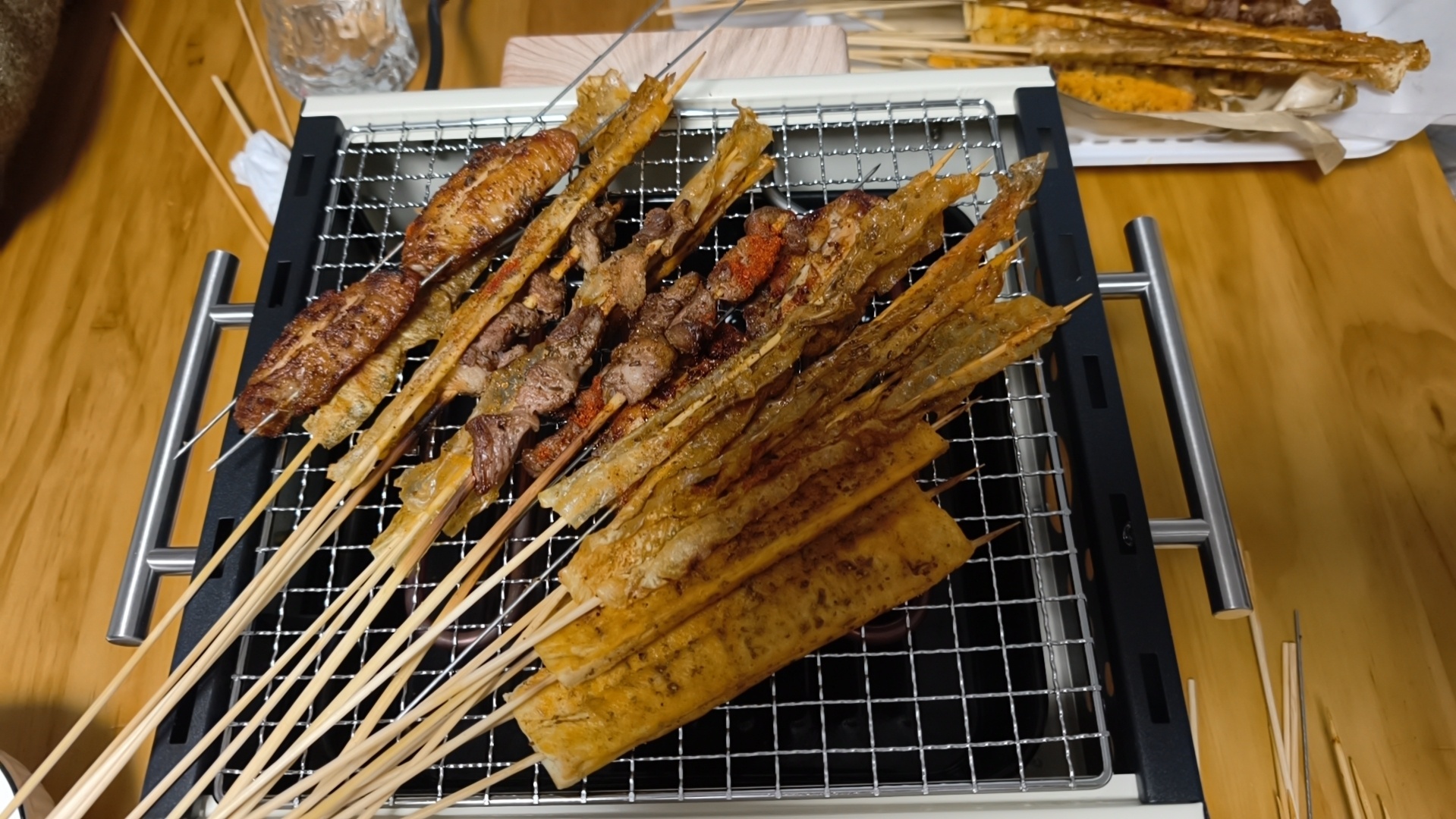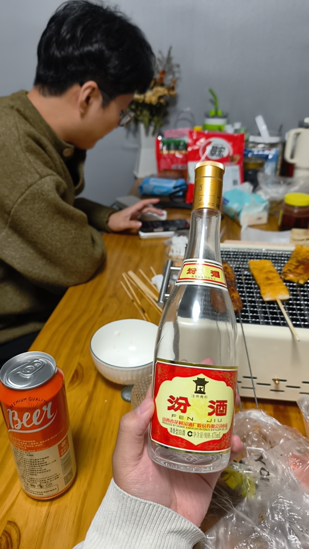 昨天晚上和朋友点了份烧烤,然后把围炉煮茶的这个炉子拿出来热着,氛围有了,然后两个人喝了一整瓶山西的汾酒我一个平时不喝酒的人,也不知道怎么这么能喝啊,把他喝的一愣一愣的