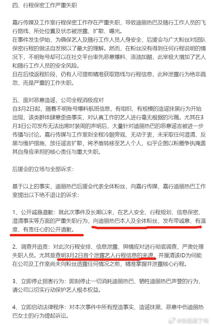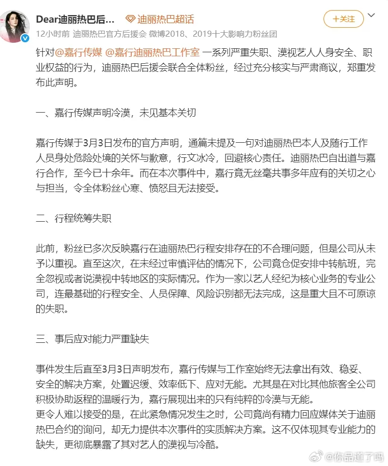迪丽热巴的粉丝后援会这是直接跟嘉行杠上了啊!后援会发了声明,意思很明确:嘉行传媒必须就迪丽热巴滞留迪拜这事儿,给迪丽热巴本人和粉丝一个道歉。还得把第一个把消息捅出去的工作人员揪出来,另外,公司得赶紧去告那些黑粉!按说粉丝这么公开硬刚,多半是艺人或者工作室早就对经纪公司不满,不然哪会闹这么大动静。
