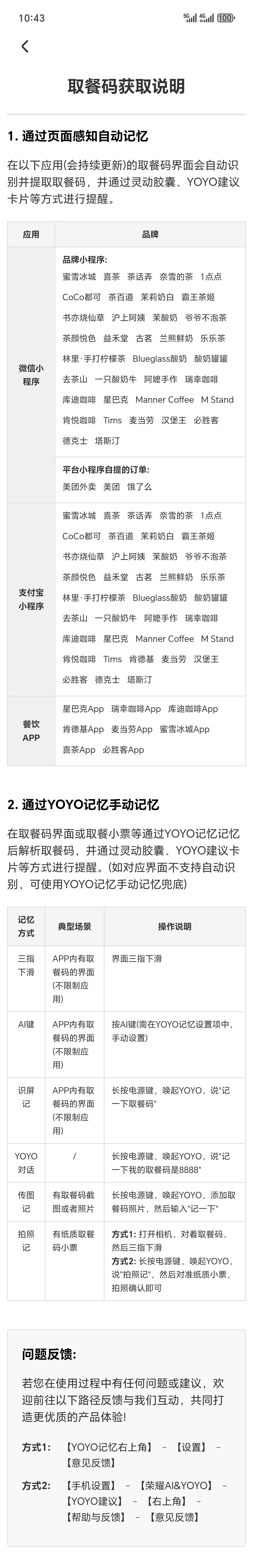 取餐码提醒支持自动记忆和手动记忆,支持微信小程序、支付宝小程序、美团和淘宝闪购自提订单以及餐饮APP