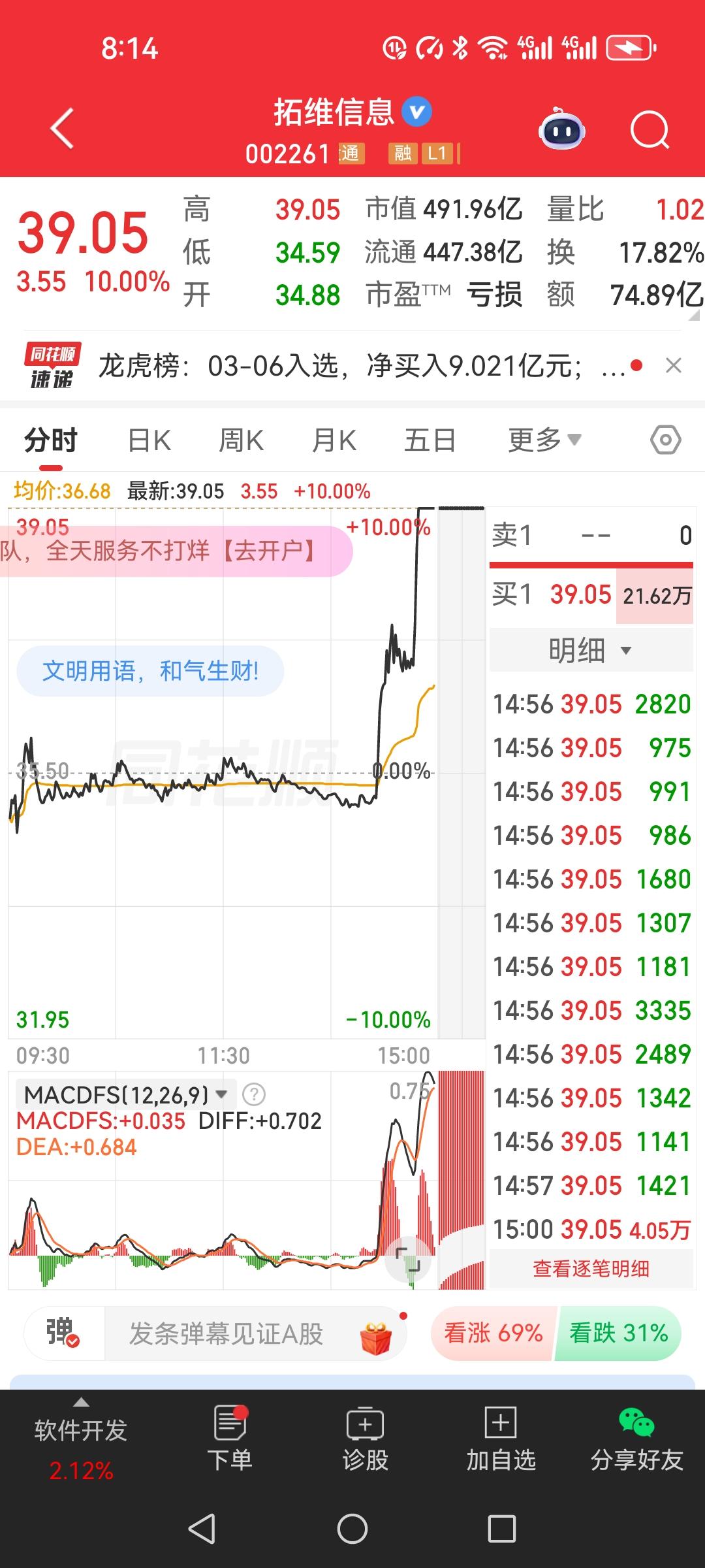 上午盯盘拓维信息,开盘35.50,眼瞅着它一路滑到34.88,最低砸到34.59的时候,心脏差点从嗓子眼蹦出来。那一刻手指已经悬在卖出键上了,想着“完了完了,这是要跳水的节奏”。 但我还是给自己画了条红线——不管今天怎么折腾,37.00就出一半。要是真跌穿了,那就随它去吧,反正这个位置我已经赚到了认知内的钱。 结果呢?盯了一上午,它就在那儿横着,像条咸鱼。我想着今天大概就这样了,泡了杯茶准备放空一下。茶刚泡好,手机“叮”的一声——拿起来一看,差点把茶喷出来:直接一根直线拉涨停!39.05 那一刻的心情,怎么说呢?就像你追了好久的女生,终于答应跟你吃饭,结果你想着“再等等看有没有更好的”,回头人家已经挽着别人胳膊走了。 半仓的利润,就这么被一杯茶偷走了。不过回头想想,赚到自己认知范围内的钱就好,超出认知的,就当是市场给你上的课,虽然这堂课学费有点贵。