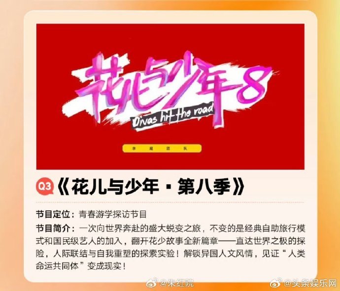 花儿与少年8网传阵容网传花儿与少年8最终阵容《花儿与少年8》网传阵容引热议,拟邀姐姐团和弟弟团都很有看点,7月赴秘鲁等地录制,期待节目能早日和大家见面。