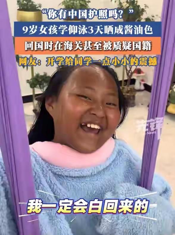 近日,河北衡水。9岁女孩在泰国曼谷旅游期间,3天连续练习仰泳晒成酱油色,发出晒黑后照片引发网友热议。孩子妈妈王女士表示,孩子对仰泳特别感兴趣,连续3天每天练习2到3小时,仰泳时面部朝天防晒不到位。孩子本身是黄黑皮,平时晒太阳就容易晒黑,没想到这次这么严重,过海关时甚至被工作人员追问是否有中国护照,大家都哭笑不得。 有网友表示:当年留学工作,垃圾食品吃太多了,胖了很多很多,结果2010年回国时候海关姐姐看着我护照上清秀的照片看了半天,要不是美签上有近期照片,估计都不让我进来了。 易黑体质,我今年建房,夏天要给楼板浇水,大中午太阳很大,穿着5分裤露着小腿和脚,也就五六天,晒成深色,到现在5个月了,小腿皮肤的颜色还没完全退回去。 有的人晒不黑,比如我,有的人见阳光就黑,比如我家属!第一次出去旅游回来她黝黑,我基本没变!后来她知道,我不怕晒,但怕风吹日晒,从此旅游专门爬山。 孩子皮肤嫩,还是要注意防嗮,孩子的一个同学去年在海南游泳一周时间,也是晒的比较黑,后来孩子脸脸颊上开始出斑了。尽快给孩子敷儿童面膜补充面部水份。 对此大家怎么看呢
