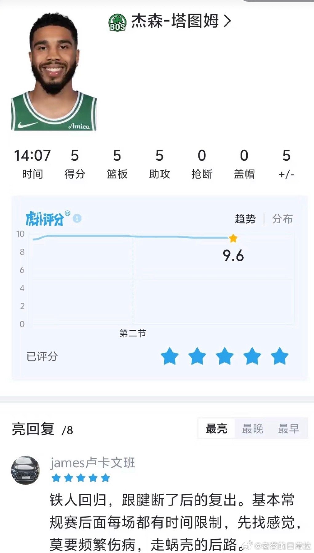 塔图姆复出 塔图姆复出贡献15分12篮板7助攻,凯尔特人多点开花,以120-100轻取独行侠,送给对手六连败。