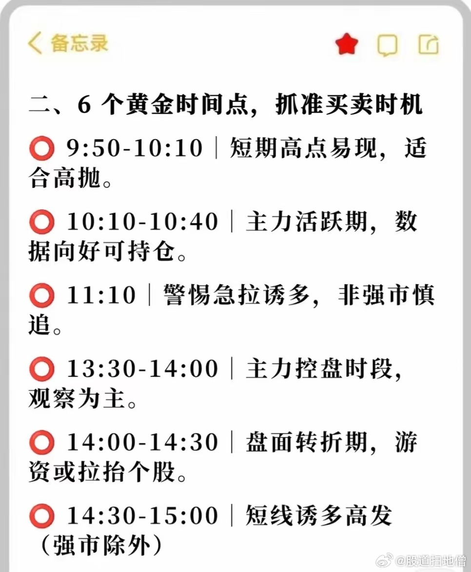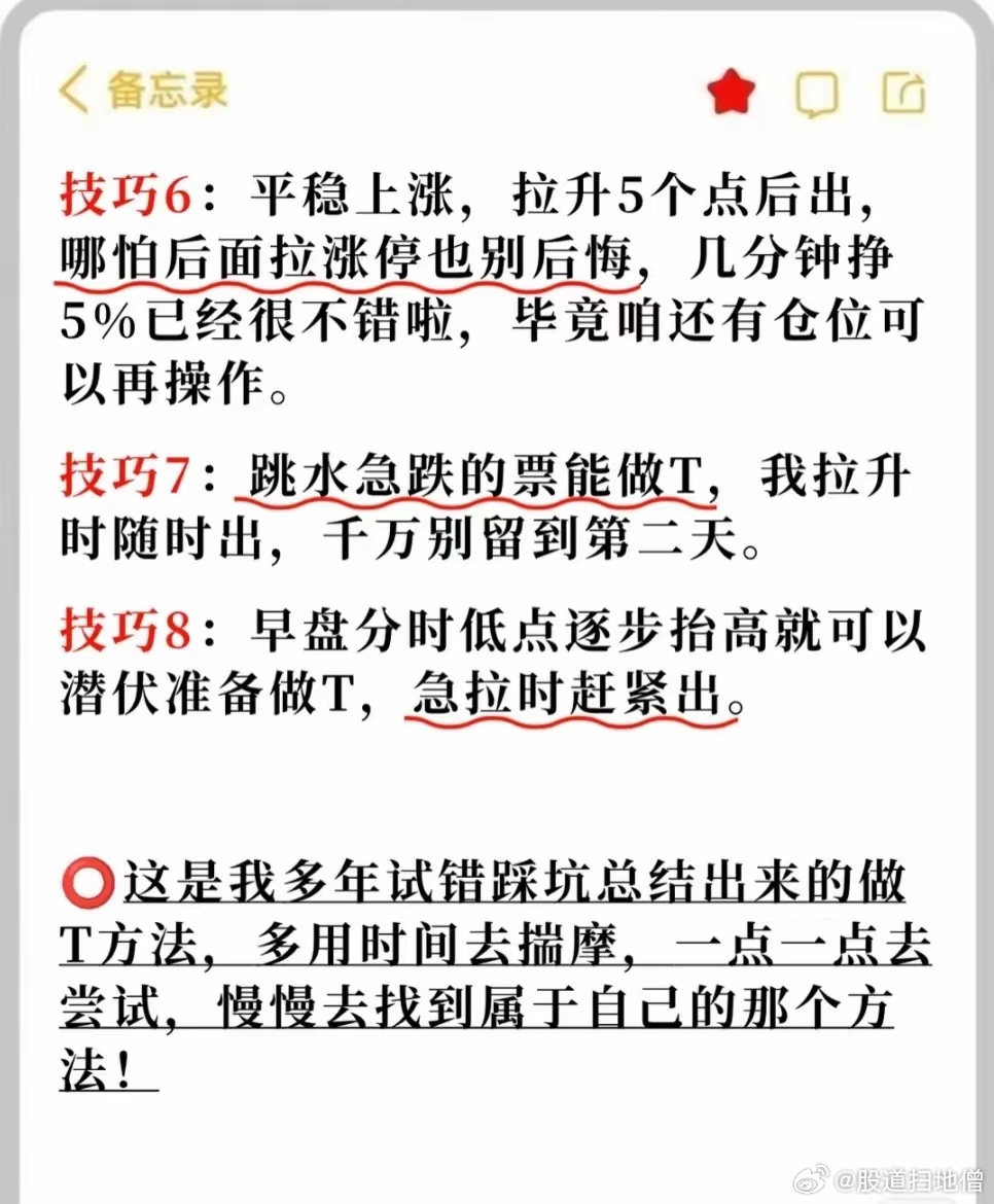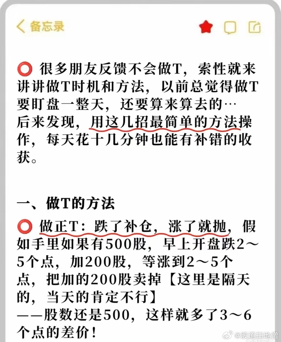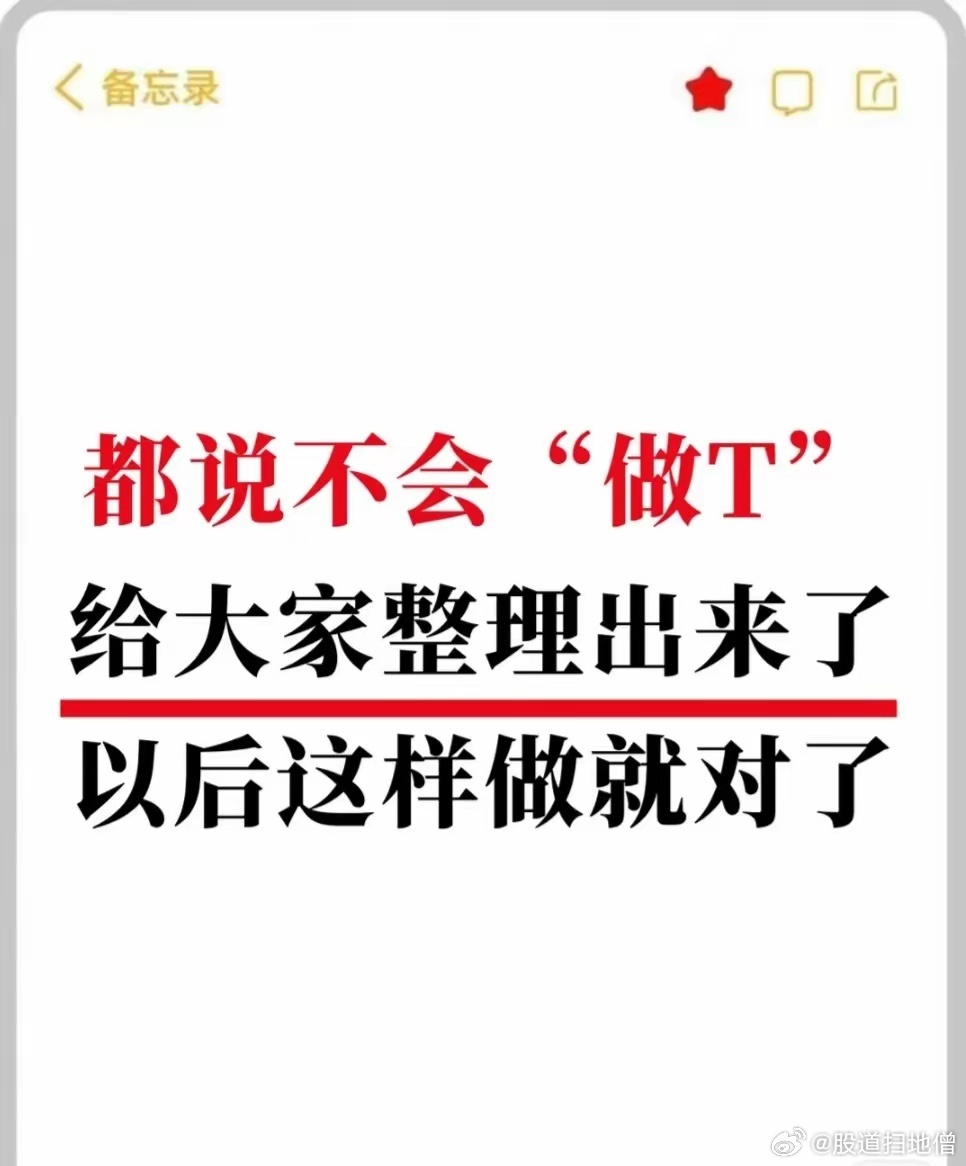 股票“做T”的方法、时机、技巧及注意事项,具体如下:1. 做T方法:①正T:跌后补仓,涨后抛售(隔天操作),保持原股数赚差价;②反T:冲高先卖,回落接回,持仓不变获利。2. 黄金时间点:9:50 - 10:10高抛、10:10 - 10:40看数据持仓、11:10警惕诱多慎追、13:30 - 14:00观察、14:00 - 14:30游资拉抬、14:30 - 15:00(强市除外)防诱多。3. 做T技巧:开盘低位震荡、急跌超5点、急拉无低位机会、逢高出不买进、拉升幅度小横盘票不做、平稳上涨拉5点出、跳水急跌票急拉出、早盘低点抬高潜伏急拉出等。4. 注意事项:每次动一半仓位、见好就收、错了认赔不硬扛。