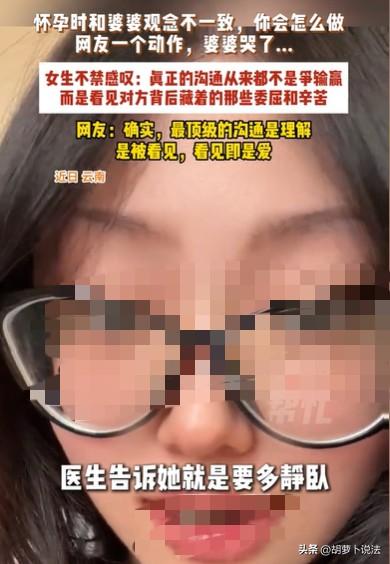 “这就是顶级沟通的结果。”云南,女子怀孕不舒服,就去检查,医生告诉她,要她多静卧,她婆婆不理解,觉得怀孕就要多散步,就算女子解释,婆婆还是不停地她耳边唠叨,还说:“我以前怀孕的时候,还下地干活呢!”女子听了,没有生气,反而赶紧抱住婆婆,她只说了一句话,婆婆从此不再说她,反而理解她,照顾她。 自从怀孕之后,女子一直小心翼翼,她无比期待,孩子降临的那一刻。 可她怀孕没多久,就感到身体有些不舒服,她很是担忧,就去看医生。 幸好她来检查了,医生告诉她,像她这种情况,不能多走动,就是要多静卧,才能保证孩子顺利出生。 医生的话,女子不敢不听,回到家之后,除了吃喝拉撒,她大部分时间都躺着。 每次她躺的时候,都能感受到,孩子在她肚子里,努力地生长着,躺着的时刻,让她感到无比的幸福。 可婆婆不乐意了,一看着女子躺着,那懒洋洋的样子,让她越看越糟心,她就不理解了,怀孕了,为什么还要这么躺着,这对孩子多不好,怀孕了就应该多走动,到外面多散散步,只有这样了,生孩子的时候才不会那么遭罪。 婆婆看着女子那么懒,她终于还是忍不住说女子了,她让女子多出去走走,散散步,这也是为了孩子好。 女子理解婆婆,毕竟怀孕之后,一般的人都需要多走动,才能顺利生孩子。 可她现在的情况不一样,医生让她多静卧,她就得听医生的,婆婆不是医生,大多数人的经验也不适合她。 她知道婆婆也是为了她好,婆婆这么说,也没有错,既然婆婆不知道原因,她就应该和婆婆解释。 她告诉婆婆,医生让她多静卧,就应该听医生的。 可婆婆还是不理解,在婆婆看来,医生的话也不能全听,她还是劝女子多走动,多散步。 女子见婆婆不理解,她都不知道如何解释了,只能敷衍婆婆。 婆婆一看女子敷衍她,终于说出了自己的怀孕经历,她说:“以前我怀孕的时候,还下地干活呢!” 女子看着婆婆,她知道这一刻,争执没有任何意义。 她没有解释,没有争论,只是站起来,紧紧地抱着婆婆,她只说了一句话:“妈妈,你以前真的太辛苦了,但是以后不会了,我和你儿子会养着你的。” 就是这么一句话,婆婆再也没有说过她静卧的事情了,婆婆反而背着他们,一直抹眼泪,婆婆感动了。 从此女子安心静卧养胎,婆婆尽量地照顾她,她们俩再也没有因为怀孕观念不一样,发生过争执。 不得不说女子的情商实在太高了,她很清楚婆婆是为她好,她也很清楚,婆婆说出以前怀孕的经历,并不是想让她像婆婆一样,怀孕了还要下地干活。 婆婆不过是想用自己曾经受过的委屈,来劝女子不要那么矫情,怀孕了,该散步就散步。 女子深深地感受到,婆婆怀孕时不容易,她理解婆婆为什么会如此说话,她看得见婆婆作为姑娘时的不容易。 正是她的一个拥抱,正是她给婆婆的承诺,似乎在拥抱着曾经受委屈的姑娘,婆婆感受到了儿媳妇带给她的温暖,儿媳妇如此懂她,作为婆婆,她再也不能让自己曾经受过的委屈,让自己的儿媳妇再吃一遍。 这真的是顶级的沟通,多少人听到婆婆说曾经的事情,会有反驳,会说没苦硬吃,如果儿媳妇非得要和婆婆争执,婆媳之争,肯定是难免的。 一旦争吵,女子也不能安心养胎,但女子看得见婆婆的委屈,也理解婆婆对她的好,所以她用行动,化解婆婆的担忧,她们之间的事情,这才得到解决。 不得不说,高情商的女子用一句话,化解了婆媳观念不一样,带来的矛盾,如此高情商的说话,肯定是有利于家风建设的。 对于一个家庭来说,什么是最重要的? 1、 家风建设最重要。 《民法典》第1043条规定:家庭应当树立优良家风,弘扬家庭美德,重视家庭文明建设。夫妻应当互相忠实,互相尊重,互相关爱;家庭成员间应当敬老爱幼,互相帮助,维护平等、和睦、文明的婚姻家庭关系。 像女子如此说话,理解婆婆曾经受过的委屈,理解婆婆为她好,婆婆也会同样理解她。 2、 晚辈要赡养长辈。 《民法典》第1067条规定:成年子女不履行赡养义务的,缺乏劳动能力或者生活困难的父母,有要求成年子女给付赡养费的权利。 女子理解婆婆曾经的委屈,用赡养的语气跟婆婆说话,让婆婆知道,以后不会再受委屈,婆婆才会尽自己所能协助他们的小家。 不得不说,有这样的儿媳妇,婆媳关系不会很差。 那么,遇到这种事情,你会怎么做呢?