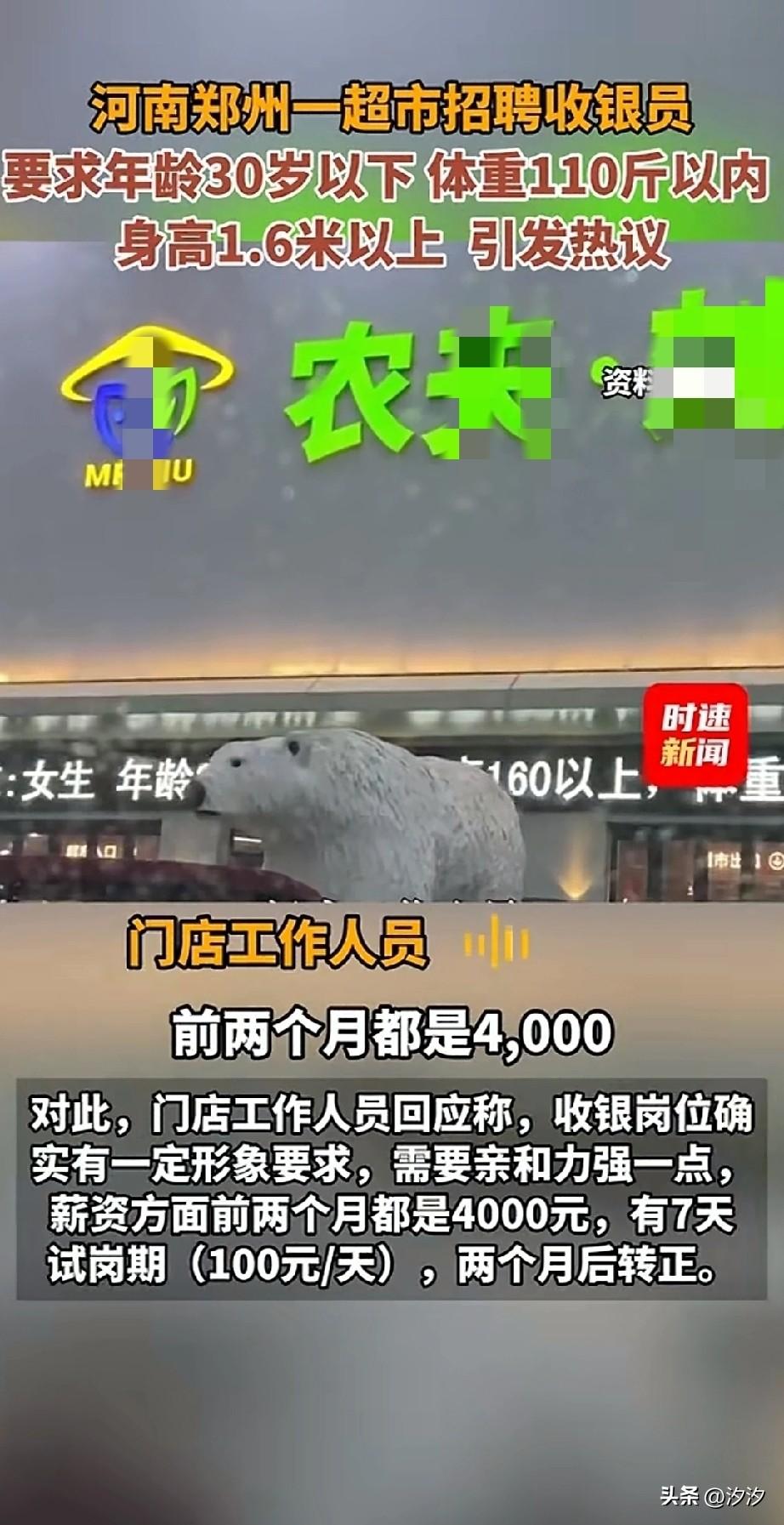 郑州某超市招聘收银员, 居然要求年龄30岁以下, 身高1米6以上, 体重110斤以内, 长相还要求要有甜美亲和力, 前两个月都是4000块钱, 还有五险一金, 还有试岗期, 试岗期7天,每天100块钱, 这个招聘直接引起了网友的热议, 网友表示一个超市的收银员要求还这么高,30岁以上的女生是不会收银还是不会干活? 怪不得大家都在说, 35岁以上显我老, 退休的时候嫌我太年轻, 就连养老金的年限也延长了5年, 想着让大家能做工作久一点, 但实际上35岁以后就不好找工作, 自己能干到40,50岁的都是大熊猫, 怪不得现在的年轻人交社保的人少了, 不是不想去交这个社保, 而是现在根本不知道未来会怎么样, 不知道哪一天就失业了, 如果连饭都吃不上, 还怎么去交这个东西? 大家对于现在的就业情况怎么看? 郑州 超市员 超市收银兼职 实体店收银员 实体店收银员