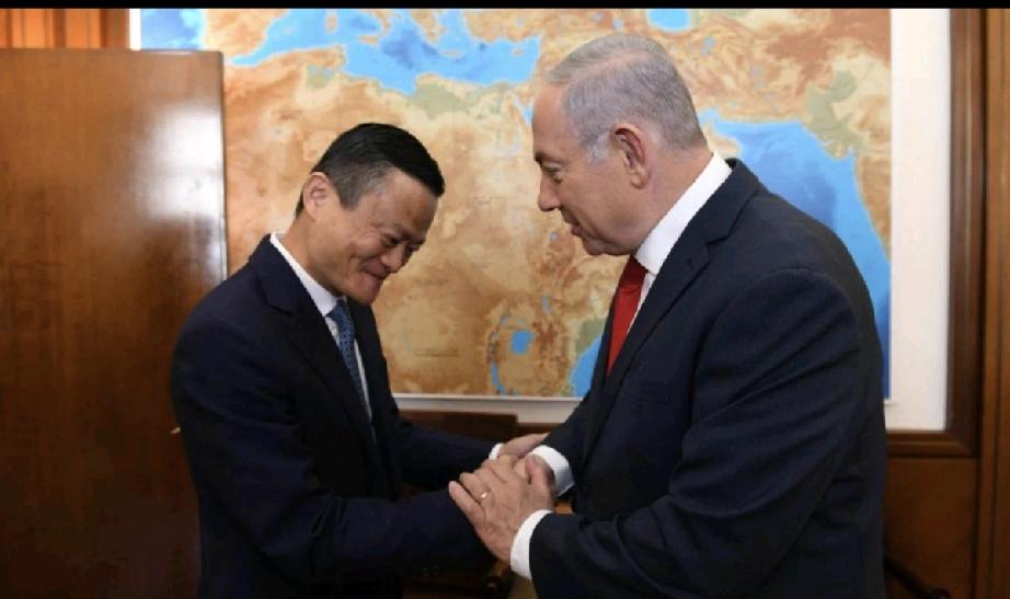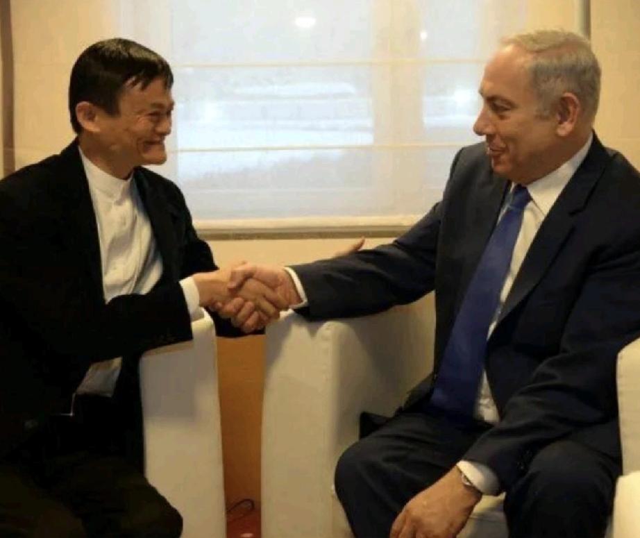 马云和内塔尼亚胡握手。 内塔尼亚胡的头比马云的大, 都说头大的人聪明; 马云的头虽然小, 但这一点不影响他的高智商。
