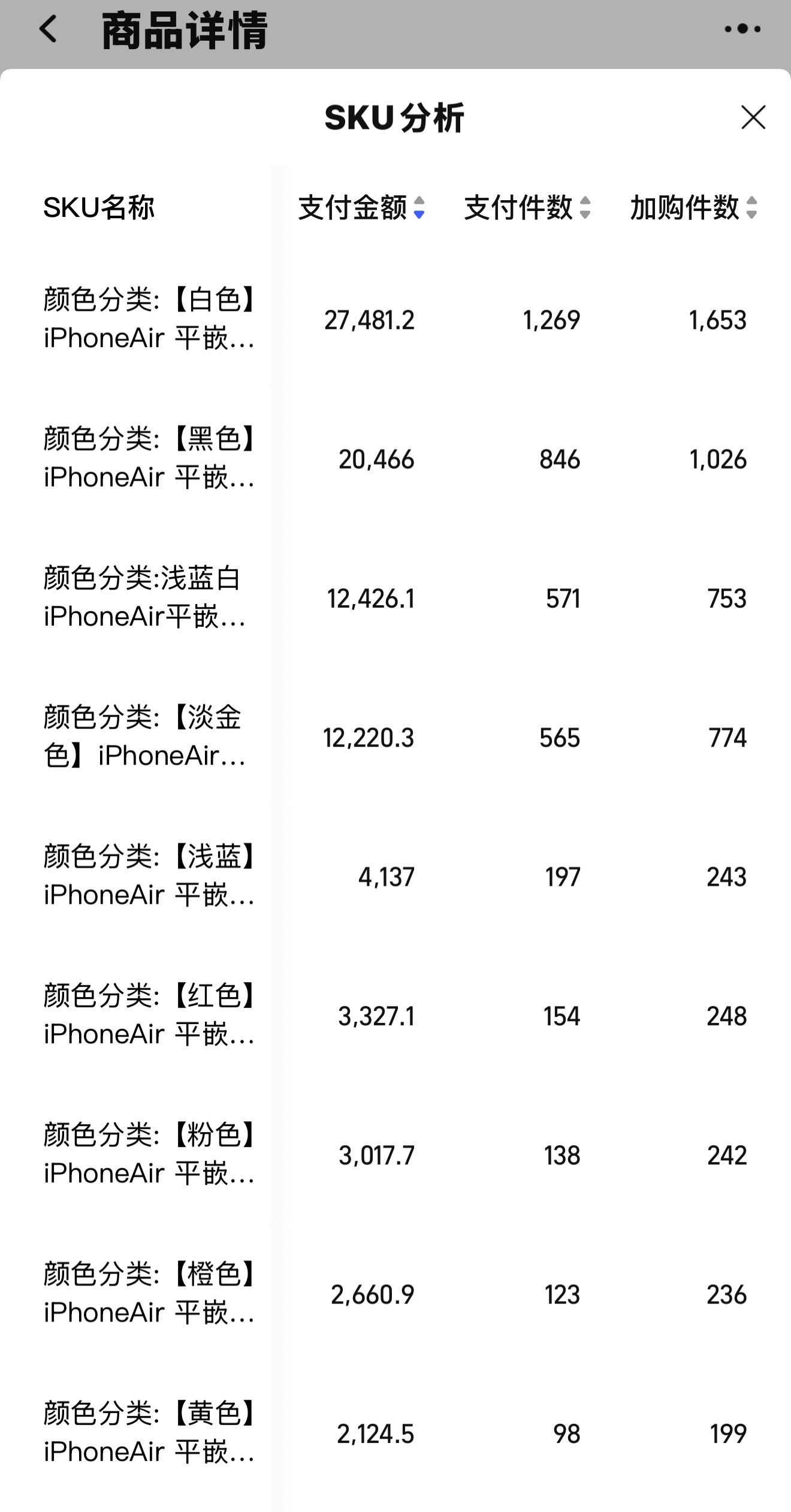 给大家看看我们近30天 iPhoneAir 平嵌镜盖的销售情况,可以大致推导出来手机的颜色销量白色一骑绝尘。我是没想到黑色居然排第二。即便是这么淡的金色,依然是最不受欢迎的。