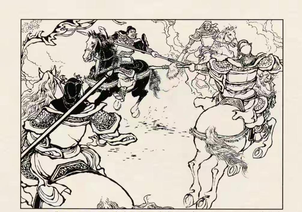 三国演义连环画:张飞的高光时刻!火烧赤壁之后,曹军三将夹攻他,左边徐晃,右边许褚,中间这位使枪的是谁?有知道的吗?
