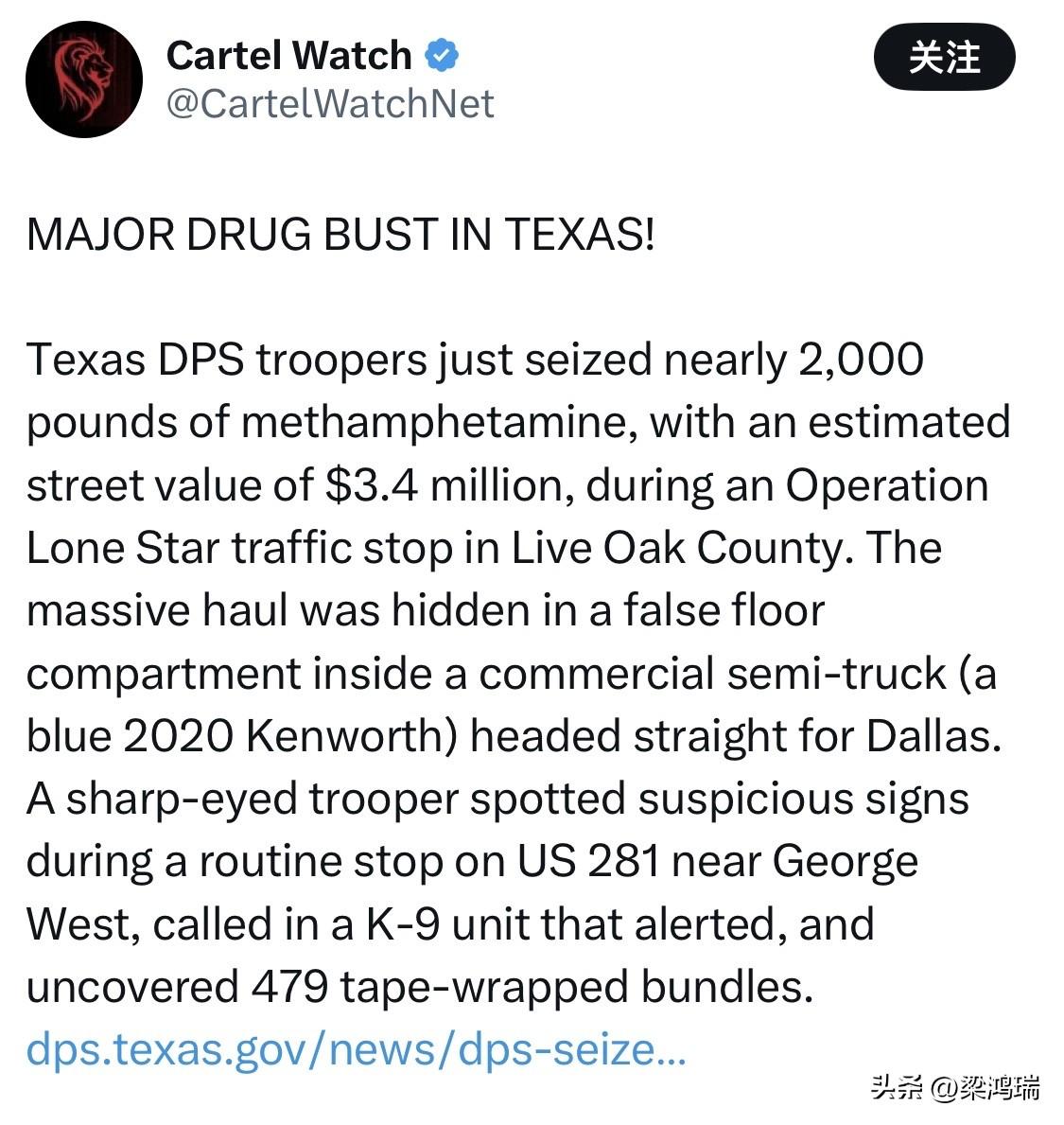 2026年3月4日下午 3:30 左右,德州公共安全部(DPS)警员在 281号美国国道 靠近 乔治韦斯特(George West) 处实施了交通拦截。 警员共查获了约 1,916 磅(约 869 公斤) 的冰毒,这些毒品被分装在 479 个 用胶带严密包裹的捆包中。一名警员在例行交通拦截中察觉异样,随后由 K-9 缉毒犬 现场发出警报,从而揭开了这个巨大的毒品“暗格”。 该卡车当时正准备将这批市值约 340 万美元 的毒品运往达拉斯。 案件发生后,驾驶该蓝色 Kenworth 半挂卡车的 32岁 司机 Diego Mendez(来自德州奥尔顿)当场被捕。 控罪情况:Mendez 目前面临 一级重罪 指控,罪名为持有 400 克以上受控物质,并已被关押进 利弗奥克县监狱。 最新动态:德州 DPS 刑事调查部门(CID)仍在对此案进行深入调查,以挖掘潜在的跨国犯罪链条。 这批 1,980 磅(约 900 公斤)的冰毒若流入达拉斯市场,后果不堪设想。