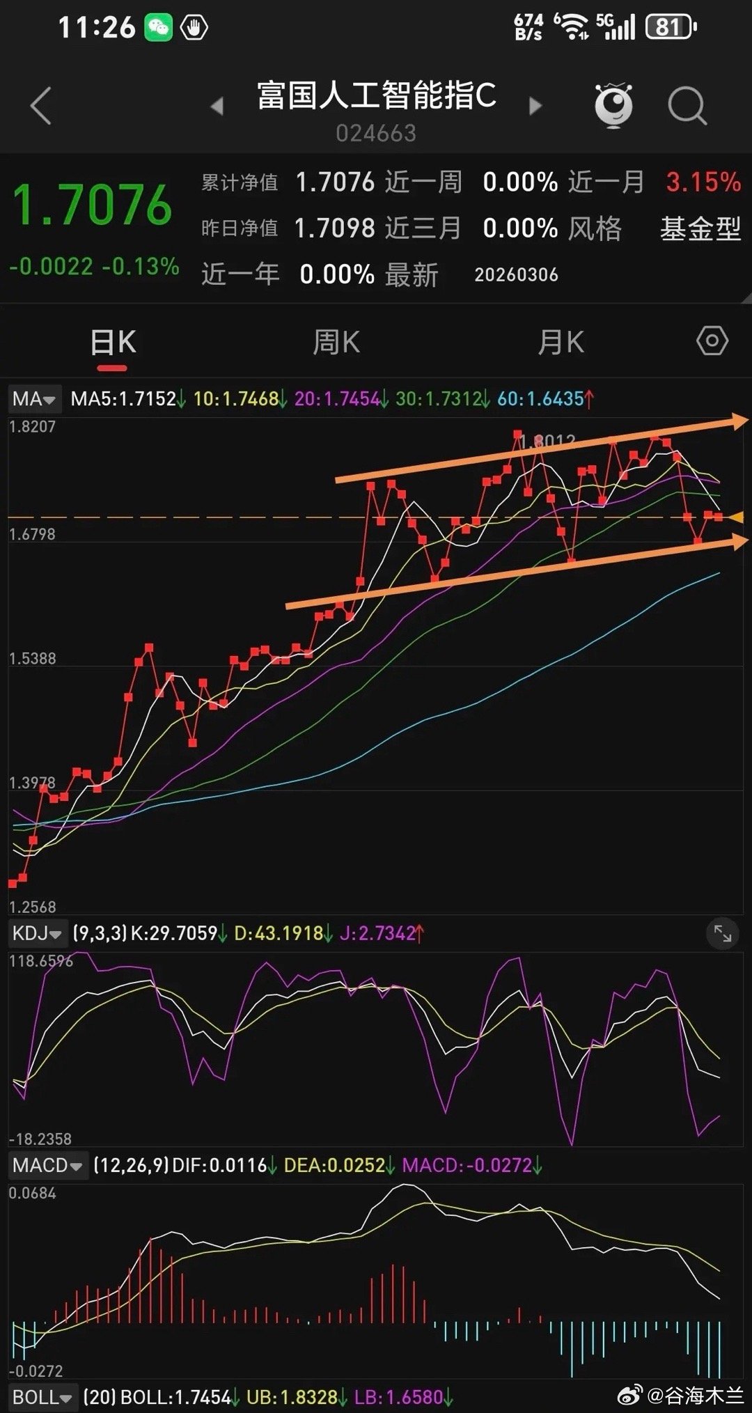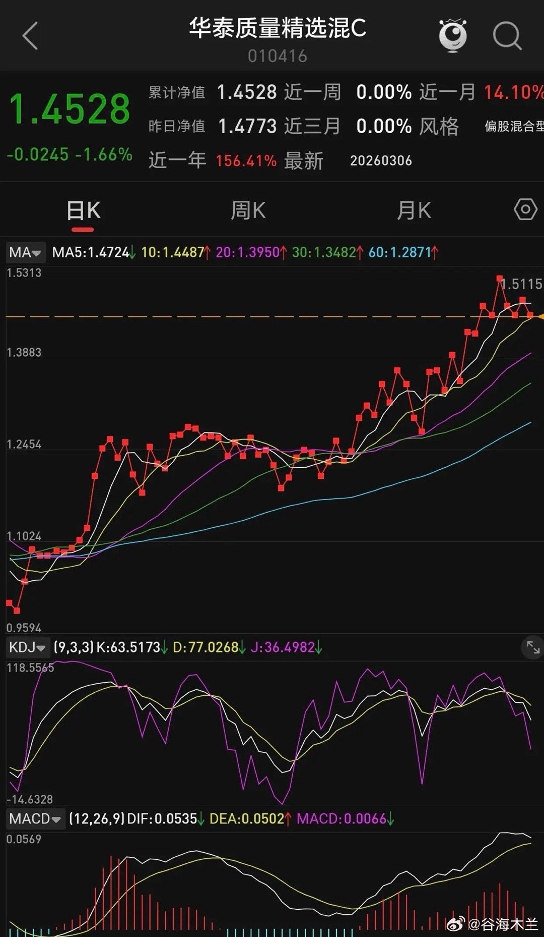 富国创业板人工智能与华泰质量精选,持仓股票基本上是属于同类型板块,一个是跟踪人工智能指数,一个是cpo混合型基金,但是,业绩不如cpo好。 富国创业板人工智能日线走势如下图所示,它短线只能做高抛低吸,否则来回坐山车,规律是从低点到高点大约7--8天。 华泰质量精选属于cpo基金,业绩表现不错,近期基本上是沿着10日线上行,前期回调规律是20日线支撑,很少跌破30日线支撑,所以等它回调到20日线支撑就可以买进。目前距离20日线支撑有4%,距30日线支撑7%,30日线回撤幅度有点大,分期逢跌买入比较合适,密切观察其走势。 经过年后运行来看,cpo赛道还是比较抗跌,涨多跌少,虽然位置比较高。
