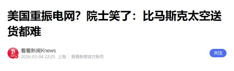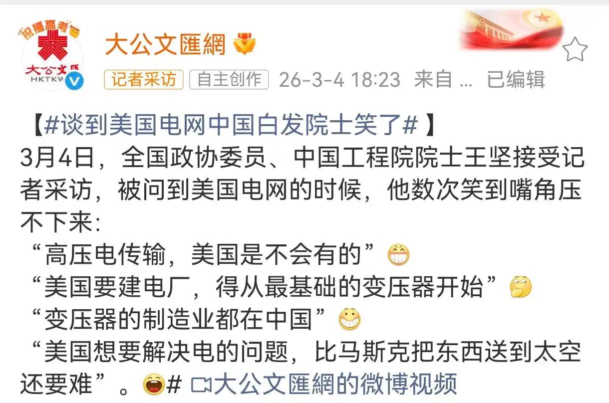 谈到美国电网,中国院士的嘴角十分难压 北京时间3月4日,中国工程院院士王坚在两会期间接受采访,当谈到美国电网时,王院士给出了这样一句评价:美国要解决电的问题,那比马斯克把东西送到太空还要困难。 这句看似直白的判断,并非随口调侃,而是基于全球能源基础设施现状的客观总结,背后藏着现代国家基础设施建设的核心逻辑。 很多人会觉得难以理解,马斯克的SpaceX实现火箭回收、推进火星探索,代表着人类航天的顶级难度,怎么会比不上改造电网?核心区别在于,太空探索是单点极致的技术突破,依靠资本与技术集中就能快速推进,而电网改造是牵一发而动全身的系统性工程,考验的是体制协调、长期规划与全民福祉的落地能力,这恰恰是美国电网难以突破的瓶颈。 美国电网始建于19世纪末,曾是全球电网建设的标杆,历经百年运行,如今早已陷入老化与割裂的双重困境,根据美国土木工程师协会的评估,美国电网基础设施平均服役年限超过40年,七成输电线路超25年设计寿命,部分变电站甚至已运行80年,长期处于超期服役的危险状态。 更棘手的是结构性问题,全美电网被分割为东部、西部、德州三大独立系统,彼此互不联通,由三千多家私营电力公司各自运营,跨区域电力调度几乎无法实现。 2021年德州寒潮中,独立电网无法获得外部支援,短短几天内数百万人断电,民众在严寒中陷入生存危机;加州常年因山火与供电缺口实施轮流停电,旧金山更是出现过老旧变电站爆炸引发大面积停电的事故,这些都不是局部故障,而是美国电网体系性失灵的直接体现。 而想要改造这套老旧系统,难度远超研发航天设备,私营电力公司以盈利为核心目标,更愿意将资金用于股东分红,而非投入回报周期长达数十年的基建升级,跨州输电线路的审批动辄需要五到十年,各州与企业的利益博弈让项目推进举步维艰。 同时,美国电力设备制造产业链严重空心化,核心的变压器等关键设备高度依赖进口,正如王坚院士所言,美国要重建电力基础设施,连最基础的设备都要从源头补齐,产业链的缺失让本就艰难的改造工程雪上加霜。 一边是不断增长的用电需求,一边是老化割裂的供电体系,美国电网已经陷入难以自救的循环,即便有充足的资金与技术,也无法打破体制与利益带来的桎梏。 反观中国,我们用数十年时间建成了全球规模最大、技术最先进的特高压输电网络,实现西电东送、北电南供的全国统一调度,中国特高压技术主导全球超八成标准,线路总长度突破5万公里,足以绕地球赤道一圈,不仅能高效输送风电、光伏等清洁能源,更能在极端天气下快速调配电力,全方位保障民生与工业用电需求。 从偏远山区的户户通电,到重大灾害后的快速抢修,中国电网的稳定性与保障能力有目共睹,这一切源自全国一盘棋的科学规划,源自民生优先的发展理念,没有复杂的利益纠葛,一切以保障社会平稳运转、服务百姓日常生活为核心。 王坚院士的对比,本质上点透了一个朴素的道理:尖端科技的突破固然耀眼,但关乎每个人日常的基础民生工程,才是国家韧性的真正底色,太空探索可以靠一家企业、一个团队攻坚克难。 而电网、交通这类基础设施,需要的是长期主义、全局视野与强大的执行能力,美国电网的困境,并非科技实力不足,而是体制与利益的桎梏,让简单的基建升级变成了无解的难题。 当然,我们不必过度吹捧自身成就,但必须认清一个事实:大国崛起从来不是只靠高光时刻,更靠那些默默支撑日常的基础工程,中国电网没有航天探索那般吸睛,却实实在在支撑着十四亿人的生产生活,支撑着数字经济、高端制造的稳步前行。 当我们享受稳定供电带来的便利时,更能明白,真正的国家实力,就藏在这些看得见、摸得着的民生保障里,藏在把每一件基础事做到极致的底气之中,这也是中国基础设施建设带给世界的重要启示。