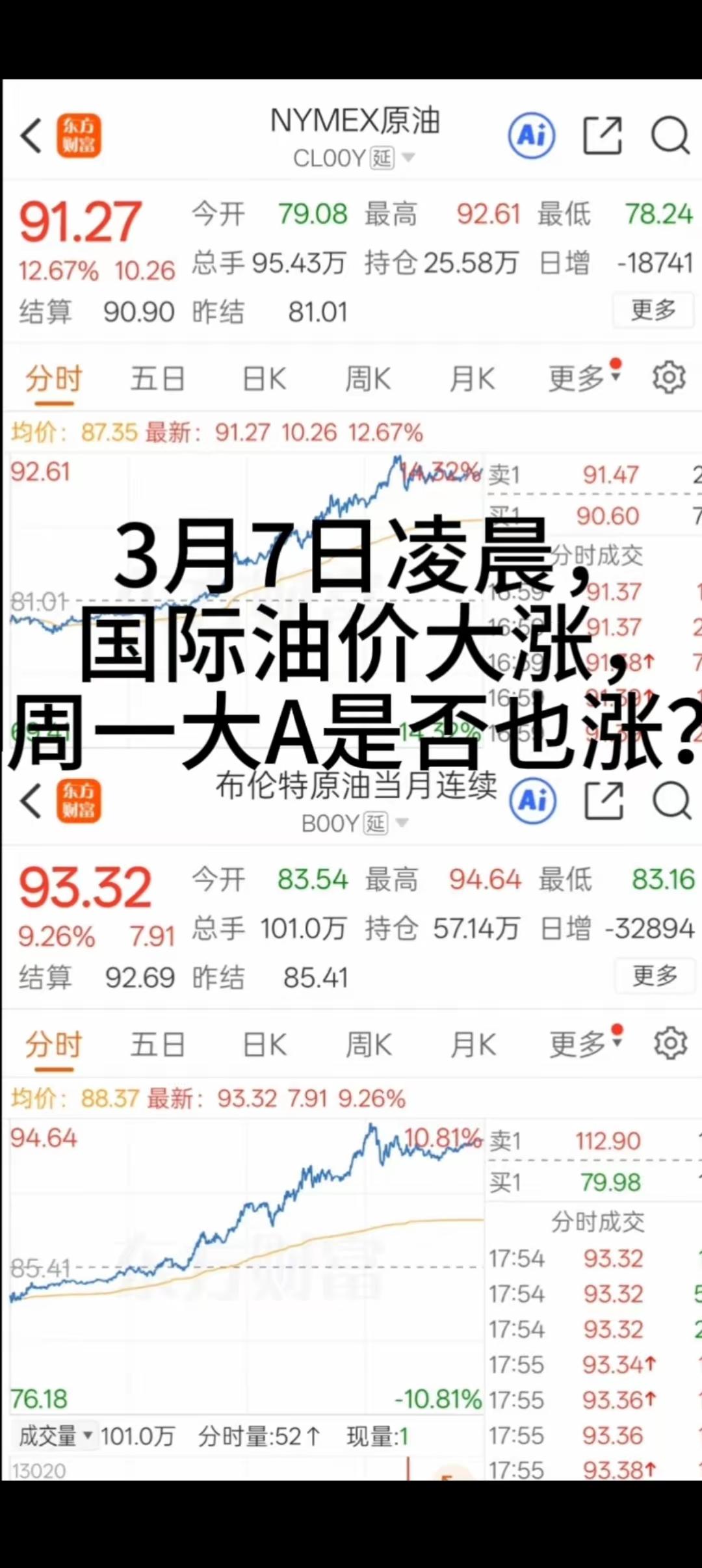 油价大暴涨!车主们赶紧去加油!北京时间3月7日凌晨收盘,国际油价迎来疯狂飙升,纽约原油期货收报91.27美元/桶,涨幅12.67%,布伦特原油期货收报93.32美元/桶,涨幅9.26%,两大原油期货双双站上90美元大关,创下近两年半以来的新高,这波涨势直接让国内油价迎来重磅调整。 下周一(3月9日)24时,国内油价调价窗口正式开启,本轮国内油价将迎来近四年来最大幅度上涨,每升涨幅超5毛钱已成定局。据金联创测算,截至3月6日第九个工作日,国内汽柴油本就该上调485元/吨,折算每升涨约4毛,而3月7日国际油价再度暴涨,直接将最终上调幅度推至超600元/吨,每升涨幅敲定0.48-0.5元以上。 以浙江省当前油价为例,92号汽油7.05元/升、95号7.5元/升、0号柴油6.71元/升,此次调价后,95号汽油将直接站上8元大关,今年国内油价也将形成“四涨一搁浅”的格局。对于车主来说,家用50升油箱的小轿车,加满一箱95号汽油将多花25元左右,大型货运车300升油箱加满则要多花150元,网约车、货运司机的运营成本也将大幅增加。