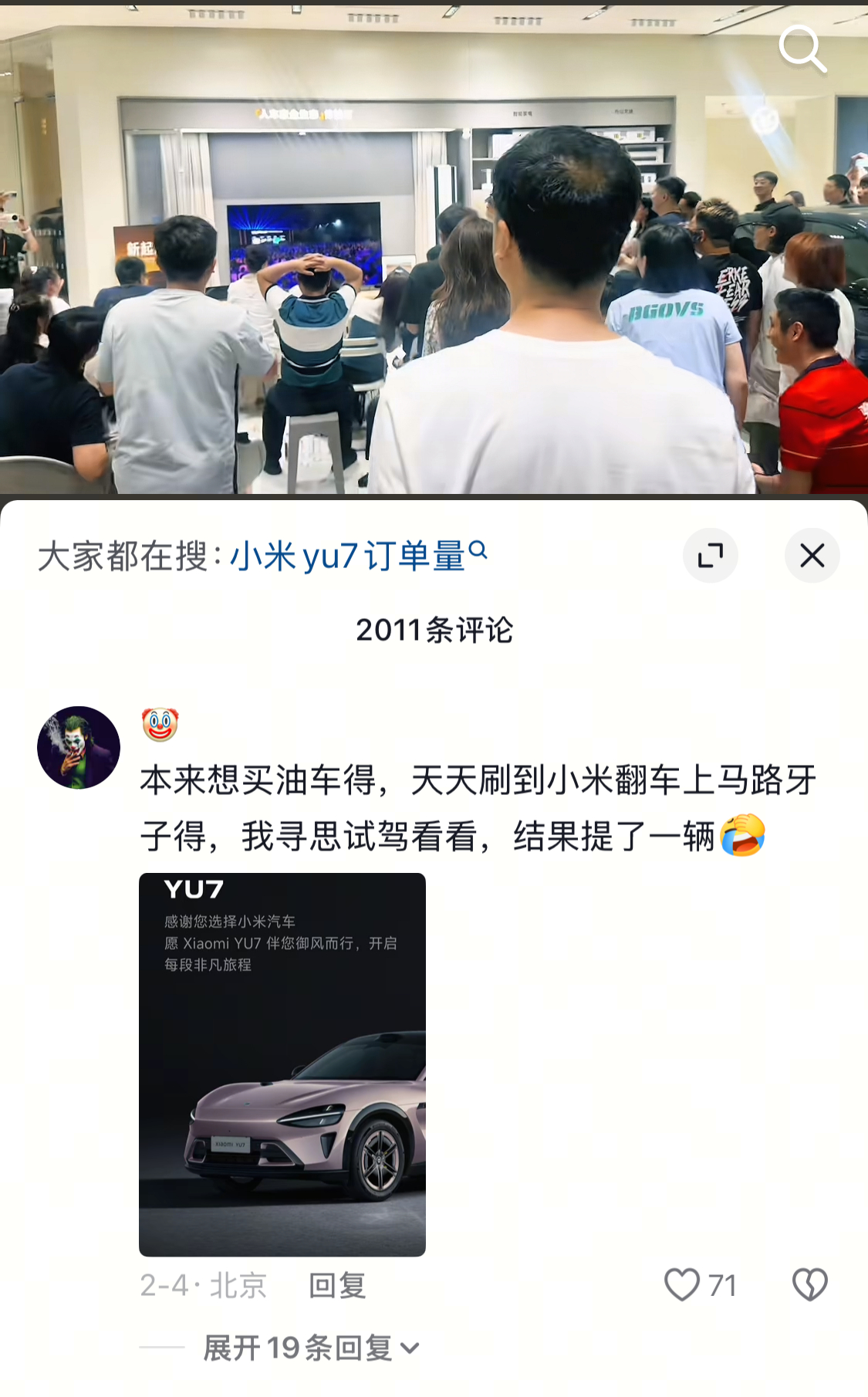 “本次想买油车的,天天刷到小米翻车上马路牙子,我寻思时间看看,结果提了一辆。”