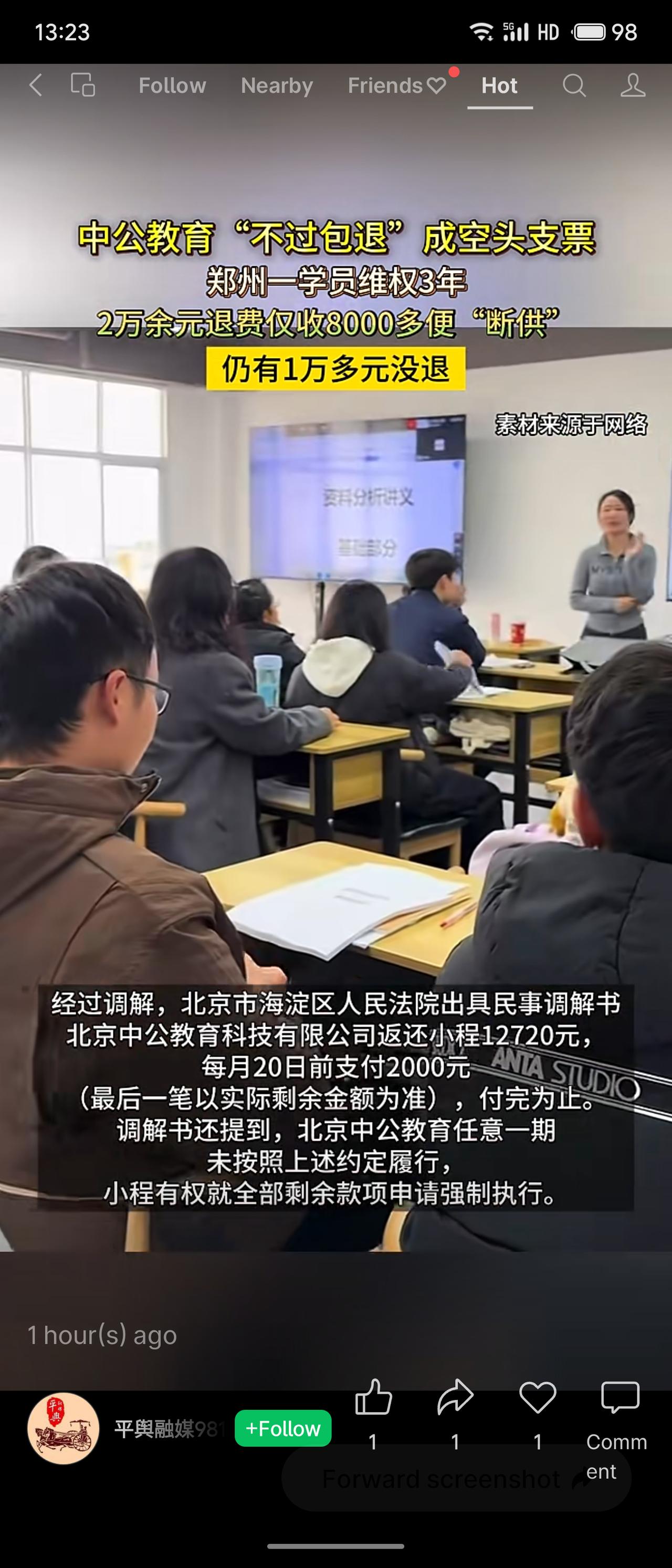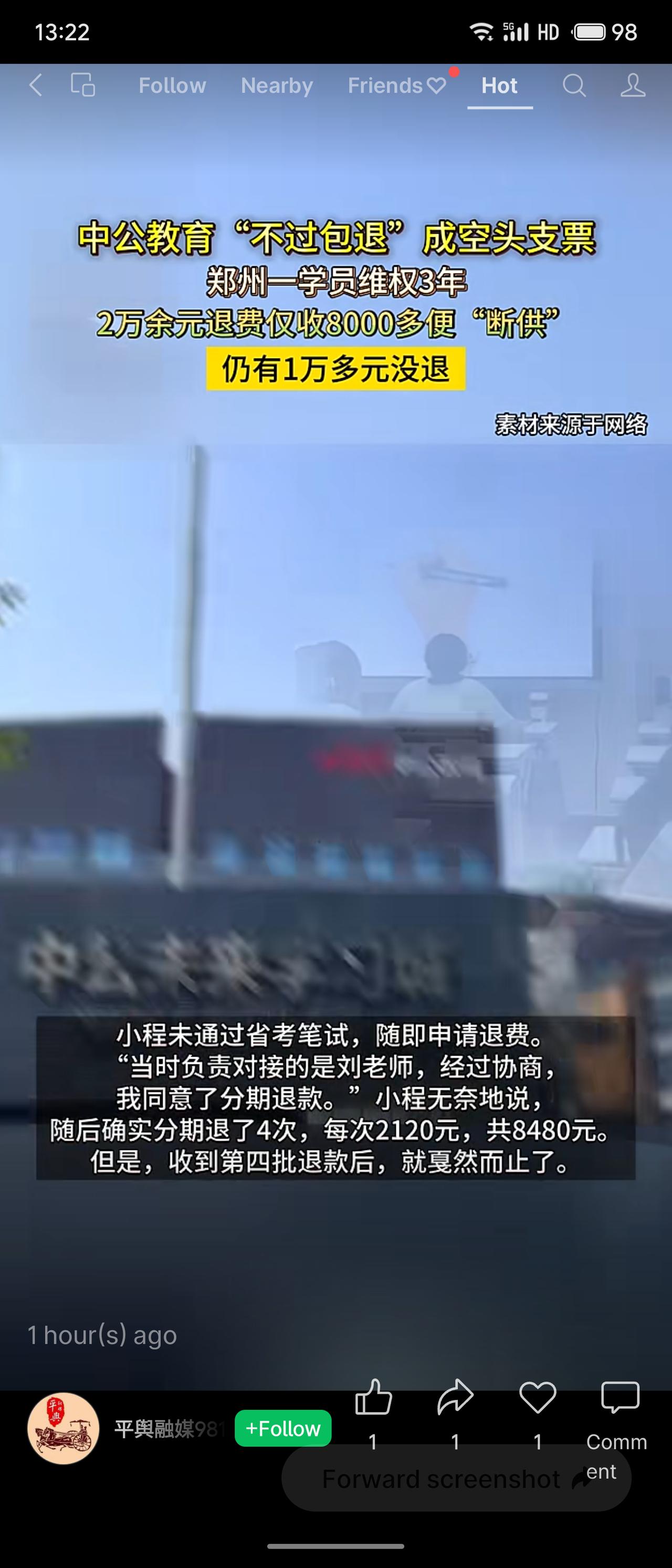郑州学员小程2019年花28000元报中公教育“不过包退”培训班,未过笔试后仅收到8480元退款便中断,剩余12720元历经三年维权才获法院调解分期支付。事件折射教育培训行业“先学后付”模式下的资金链风险,消费者权益难保障,司法救济虽有效但过程漫长。