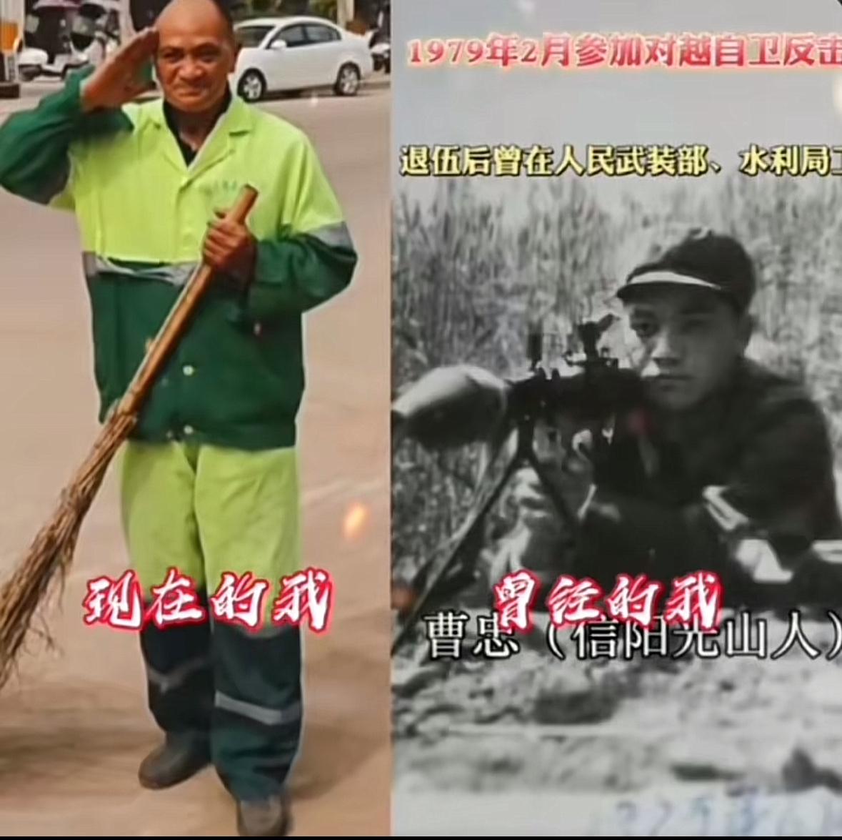 一位平凡而慈祥的老人,谁又知道他是位荣获战功的越战英雄。越战火箭筒发射手老兵曹忠!河南信阳光山人,1973年参军,1979年2月参加对越自卫反击战。1979年12月退伍回乡,分配到光山人民武装部训练各乡镇民兵营长。1980年12月调任水利局工作,1994年5月到水库管理组。退休后自愿成为一名环卫工人,依然为人民服务!多么可爱实在的河南英雄。 如今岁月或许在他身上留下痕迹,但那段浴血奋战的经历,始终是他人生中最珍贵的记忆,也是值得我们永远铭记。 曾经是因为需要你去捍卫边防,现在是你需要养家糊口,退伍不褪色,四十年如一日,平凡而伟大,一把扫帚发挥夕阳红!致敬老兵!
