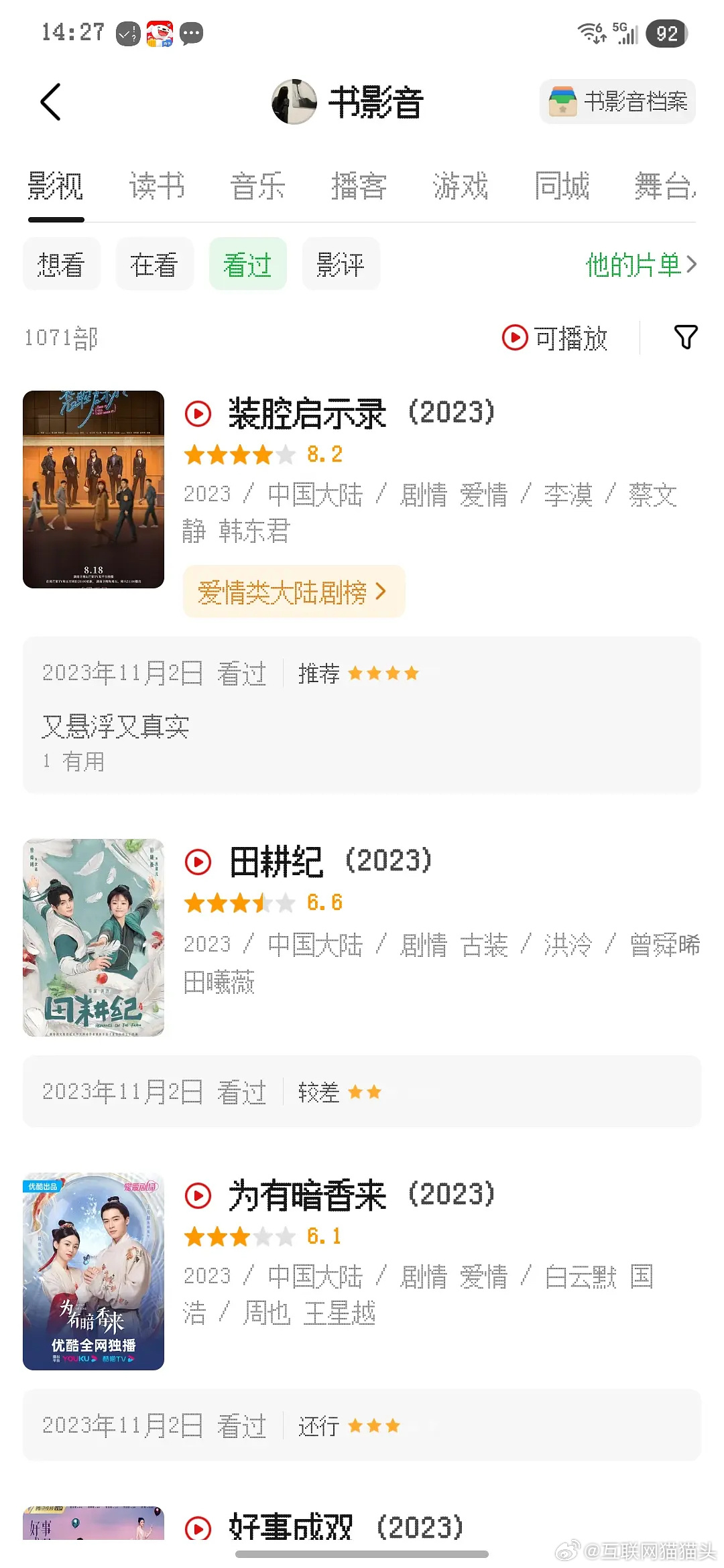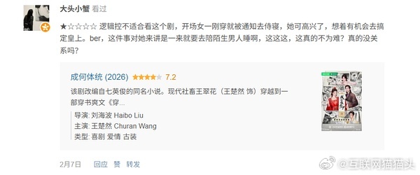 疑似🐷🐟的编剧给🍩主演的田耕纪打了2⭐给成何体统打了1⭐