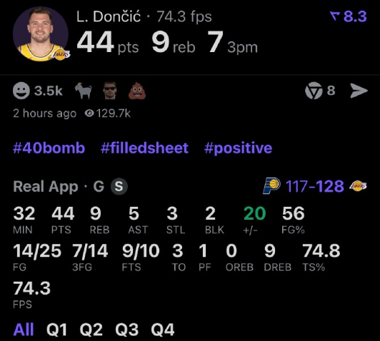 三节打卡拿下44分9篮板5助攻3抢断2盖帽,正负值+20,三分球14中7!