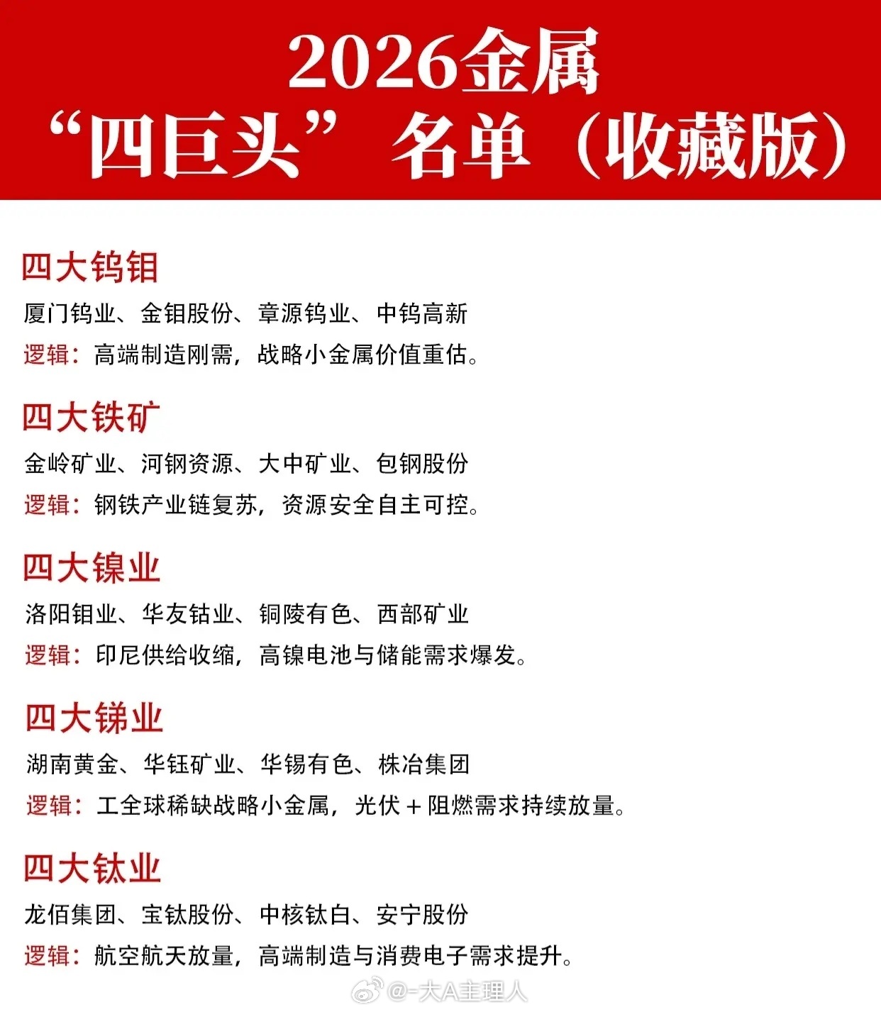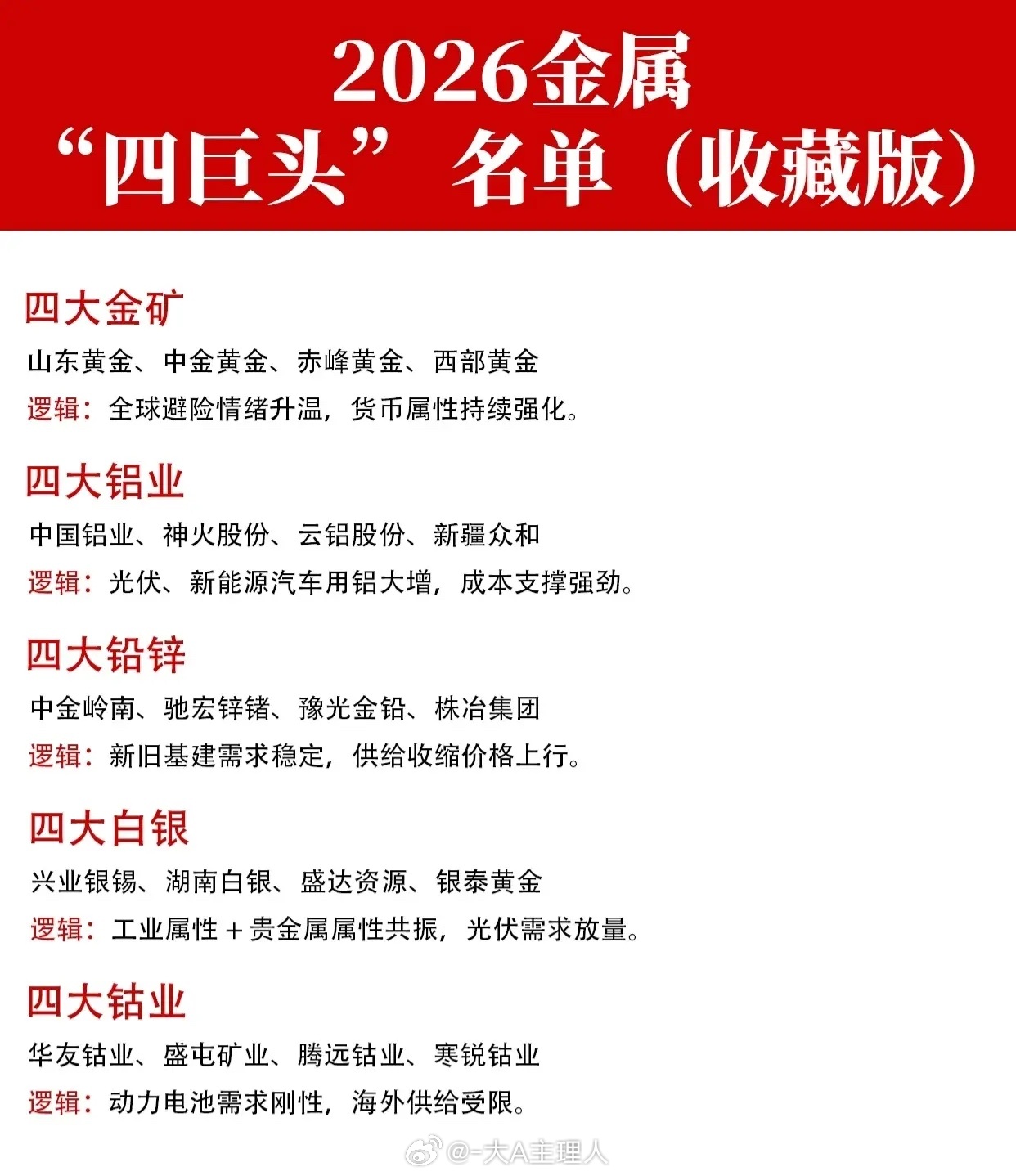 “2026金属‘四巨头’名单”,将有色金属和矿业股按不同细分领域划分为20个类别。每个类别列出了4家代表性的上市公司,并简述了其核心投资逻辑,整体呈现出一份面向2026年的主题投资策略。