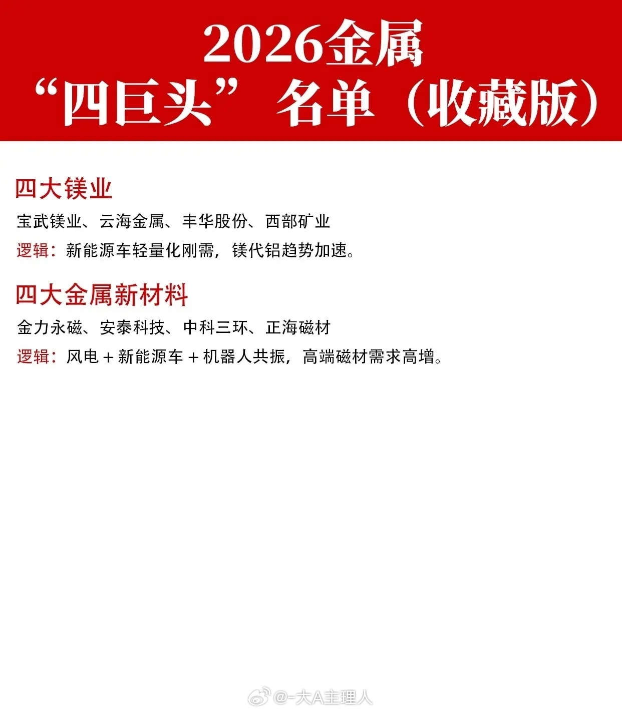 1. 核心驱动力: 所有板块的逻辑都围绕新能源(新能源车、储能、光伏)、高端制造(半导体、AI、机器人)、国家战略资源安全三大主线展开。2. 关键赛道: * 能源金属: 锂、稀土、钴、镍是核心,受益于电动车和储能需求爆发。 * 战略小金属: 锡、钨、锑、镁等因其在半导体、高端制造中的刚需或替代属性,被视为稀缺资源。 * 传统工业金属: 铜、铝、金、银等,其逻辑转向了全球供需紧平衡、成本支撑或避险货币属性。 * 新材料: 磁材等高端应用材料受益于风电、新能源车、机器人等高景气行业。3. 共性逻辑: 各板块均强调需求端(刚需、高景气)与供给端(资源稀缺、供给受限、自主可控)的共振。