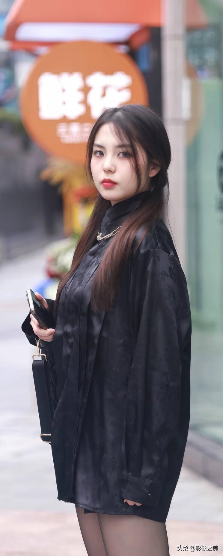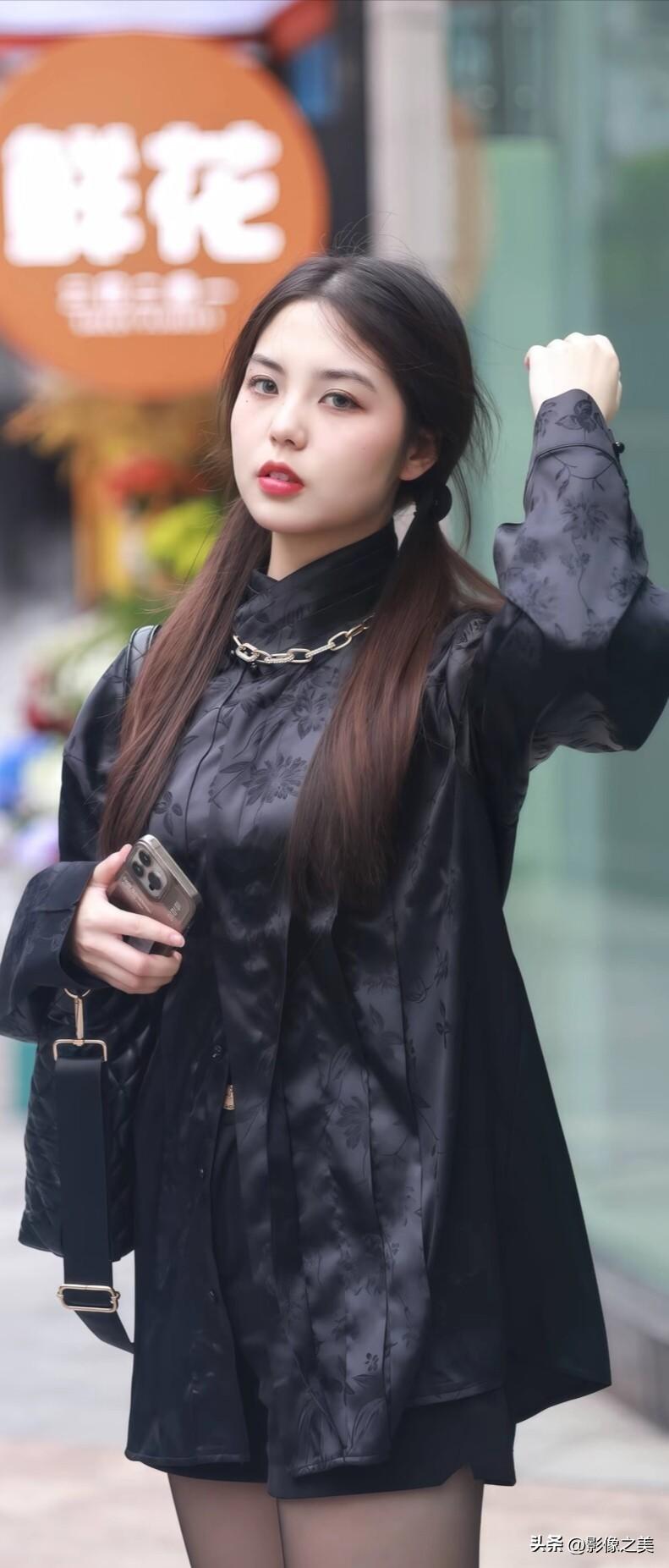 粉黑撞色小香风外套+亮面皮裙,搭配尖头鞋,甜酷感拉满~ 手持熊猫发箍,走在街头又