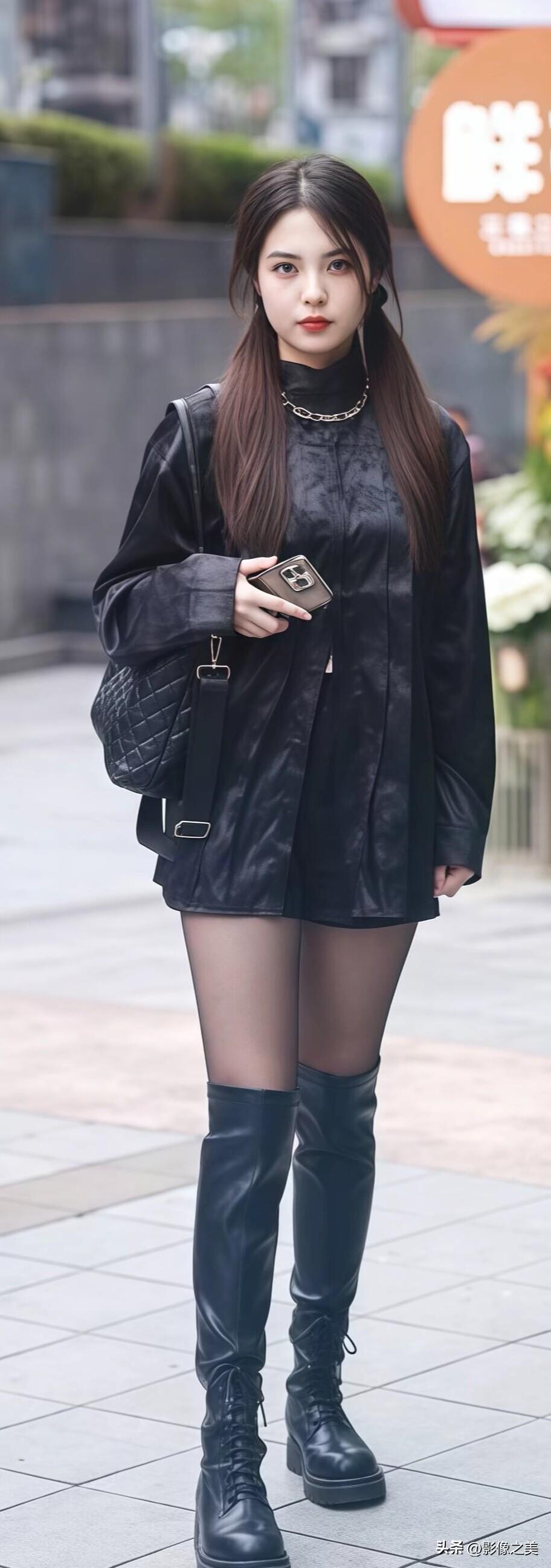 全黑穿搭太显瘦了!宽松黑色衬衫配过膝长靴,简约又利落,出门这么穿,酷飒感直接拉满。