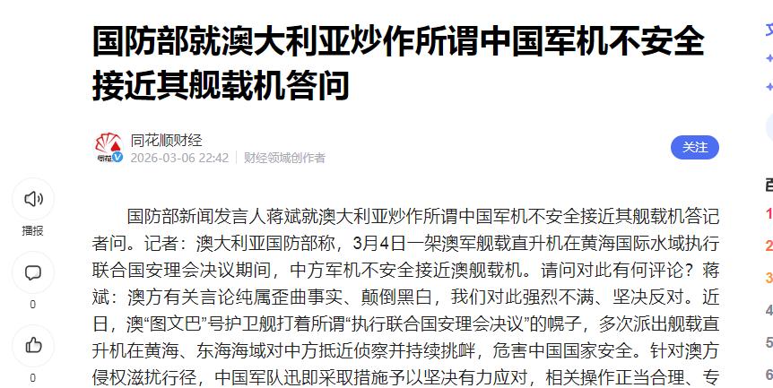 突发!中国国防部今天凌晨重磅发声,点名澳大利亚 外媒今天紧盯中国,原因是中国军方今天(3月7日)凌晨突然发布了一条极具火药味的消息,直接点名澳大利亚,措辞比以往都要严厉! 说句直白点的话,从南海到东海,从南半球到亚洲,这次澳大利亚的操作分明有点“蚂蚁撼树”的味道。 一开始很多人只看到中澳两国因为一些小摩擦上了头条,其实背后潜流涌动,牵扯到中东地缘局势、美国战略博弈,还有那一出出你方唱罢我登场的所谓“联合国决议”操作。 凌晨,国防部点名澳大利亚,通稿里那些句子简直能让人感受到中方态度的分量。 这次,不仅仅是例行“表达关切”,而是措辞比任何时候都要刚,直接点明澳方所谓的“联合国决议”是遮羞布,根本藏不住澳方的真实企图。 这种表态在过往中澳互动里可以说极为罕见。 这不是简单的口水战,是认真的,带着底气和分量,直接把澳方行为点名出来。 讲真,这种点名背后,有一层逻辑:并不是今天澳大利亚才突然跳出来刷存在感。 翻一下过去这几年,澳大利亚在我国周边活动其实没消停。 南海那几次所谓“自由航行”,澳大利亚的军舰和美军舰几乎形影不离。 他们不仅出现在南海,这次更是“冲”到了黄海、东海。 明明距自己本土上千公里,却偏偏在我国家门口晃荡,面子上说是执行“联合国决议”——实则全是幌子。 联合国相关决议里根本没规定过哪国可以拿着旗号进别国家门口肆意监视。 澳方这种做法,说白了就像是半夜翻墙进别人院子还狡辩说帮忙巡逻,这搁谁都不能忍。 这事除了看表面,咱们还得往深里琢磨下。为啥最近澳大利亚动作频繁? 有朋友会问,难不成澳大利亚有多大本事,要在我国门口刷存在感? 其实在大国博弈的棋盘上,澳大利亚基本算是棋子,不是棋手。 最近中东局势紧张,美国顾不上亚太前线,怕自己分身乏术,于是就把澳大利亚等“小伙伴”推上前台,用“执法监视”“自由航行”那套话术,想试探我国底线。 美国其实很清楚,直接在黄海、东海硬刚我国风险巨大,不划算,所以主打一个“借刀使人”。 澳大利亚这次玩的那点“技巧”,就是拍着胸脯说自己是在“执行联合国决议”,但具体看联合国文件,就知道他们的所谓“授权”是自说自话。 这点被我们国防部这次公开驳斥得非常直接。用我们的话讲,澳方行为是赤裸裸的挑衅,毫无底线。 这种表态背后,其实就是想给全世界点明一个事实:不要被部分西方媒体的话术带跑偏。 国际法早就规定,军舰、军机要进别国专属经济区和邻近海域,必须获得对方同意。 你自作主张、三天两头溜达到别国门口,妥妥的挑衅和滋扰。 说实话,这些年类似的套路我们也见多了,不光澳大利亚,美、日、加拿大这些国家的操控下,“自由航行”这个概念都快被玩坏了,甚至一度被外媒炒成“国际惯例”。 其实只要查查国际法条文,哪有这个“惯例”——更多是大国强行为自己“刷存在”的外交工具。 关键是每次这些国家搞完一波所谓自由航行,媒体高调报道,实则对地区安全秩序没有任何正面贡献,反而带来了海上摩擦、风险抬升。 反观这次我国国防部的应对,动作非常快,态度不含糊。 对澳方侵权滋扰行为,立即采取了坚决反制措施。 这些应对行动,我国一贯讲究合法合规,专业且规范。 我国海空力量一直非常克制,从未主动升级事态,更不会给对方落下任何把柄。 这种强硬但又有理有据的应对,就是维护我国主权和国家安全最有力的底气。 说得再通俗点,我们绝不会把主动权交给别人,也绝不会让任何外部势力借题发挥。 顺便提一嘴,有朋友可能担心,会不会因此刺激对方,把局势推向升级? 其实从我国一贯的策略看,这种担忧其实没必要。 我们对澳大利亚之类的滋扰行为,从来不走极端路线,也不把他们当成“真正的对手”。 国防部曾经用很生活化的比喻,说是“蚂蚁挑衅大象”,既表达了对自身实力的自信,也点明了这些行为对我国的发展影响有限。 正因为如此,我们维权反击从不逾越底线,但也绝不会后退一寸。 用行动告诉他们,想在东亚刷存在感?这块地盘还轮不到你们作主! 再看一层,更深的原因。为什么是澳大利亚,被美国推出来搞事情? 一方面,澳大利亚自身处在亚太的重要节点,和美国军事联系极其紧密。 另一方面,澳方长期跟随美国战略,被当成试探和牵制我国的“马前卒”。 平时经济贸易上离不开我国,但在安全和军事上总喜欢“作点妖”,一会跟着美国闹南海,一会又漂到黄海东海搞监视。 这种“自相矛盾”的操作,其实反映了澳方自身对地缘格局的焦虑——既不敢和我国彻底翻脸,也不甘于只当“观众”。这种心态,被美国利用得明明白白。 参考:同花顺财经——国防部就澳大利亚炒作所谓中国军机不安全接近其舰载机答问