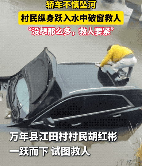 近日,江西万年县江田村一小车坠河,村民胡红彬一跃而下,用铁铲砸破驾驶室玻璃,与岸上村民合力将昏迷的司机救起。