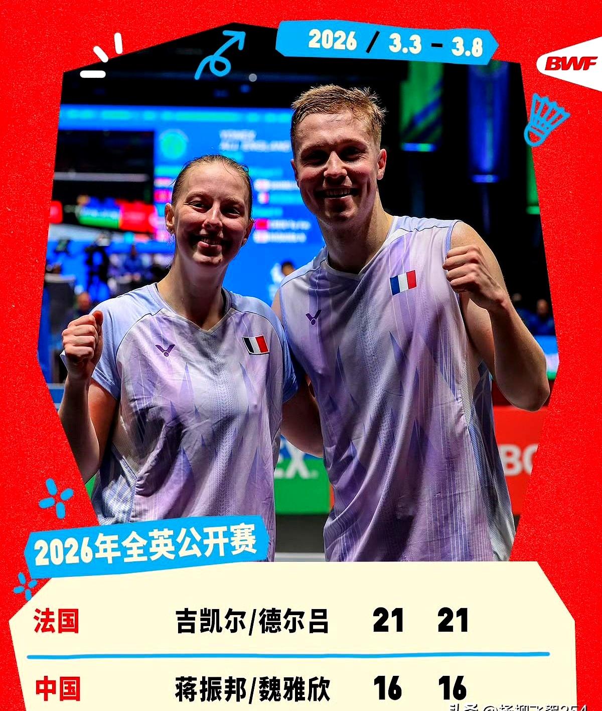 今晚看全英1/8赛,愣了半秒:世界第一凤凰组合刚爆冷出局,二号种子蒋振邦/魏雅欣背负更大压力,却被法国吉凯尔/德尔吕逼出局,0:2告负。 两局技术暂停都7:11落后,最终双局16:21,曾两次交手全胜的纪录也没派上用场。 顶级赛场教人的不是排名,而是当下那几拍的怯意与决断——别在直播里太早庆祝,冷门来得比想象快。