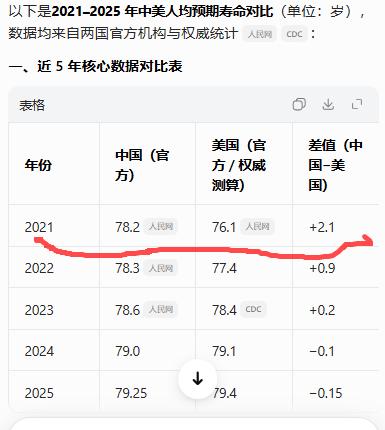 经过5年的增长和奋力追赶,我们的人均寿命从领先美国变成落后美国了。[石化] 感觉这怎么就和GDP一样,越追赶,距离越远了。[笑哭] 2025年中国人均预期寿命达79.25岁 我们2021年人均预期寿命是78.2岁,美国是76.1岁。 但是到了2025年,我们的人均预期寿命是79.25岁,美国则是79.4岁。 美国人吃了什么灵丹妙药了吗? 也不是,只是他们利用新冠疫情清除了几百万他们的“无用”人口。而我们则是拼命保下了一大波可能被新冠病毒带走的人民群众。 所以5年前,我们领先于美国不是正常情况,现在才是。 既然现在才是正常,那么问题来了。 美国是一个人均GDP达到90000万美元的国家,我们则是14000美元的国家。 我们凭什么可以做到活得和美国人一样长? 反正我不相信没有远超美国的食品安全、没有远超美国的医疗服务水平能够做到这一点。 点右上角关注我,我们一起去看这个魔幻的世界