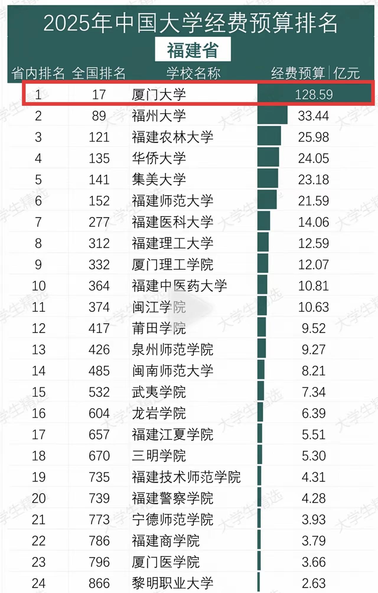 厦门大学的经费预算真高啊,2025年128亿,在福建是断档的存在,厦门大学实力也是很强,一直排在全国前20名。福建跟浙江一样,都是省内只有一所实力强大的学校,浙江是浙大。厦门大学感觉还可以合并一些高校,做强做大,提升国内排名。