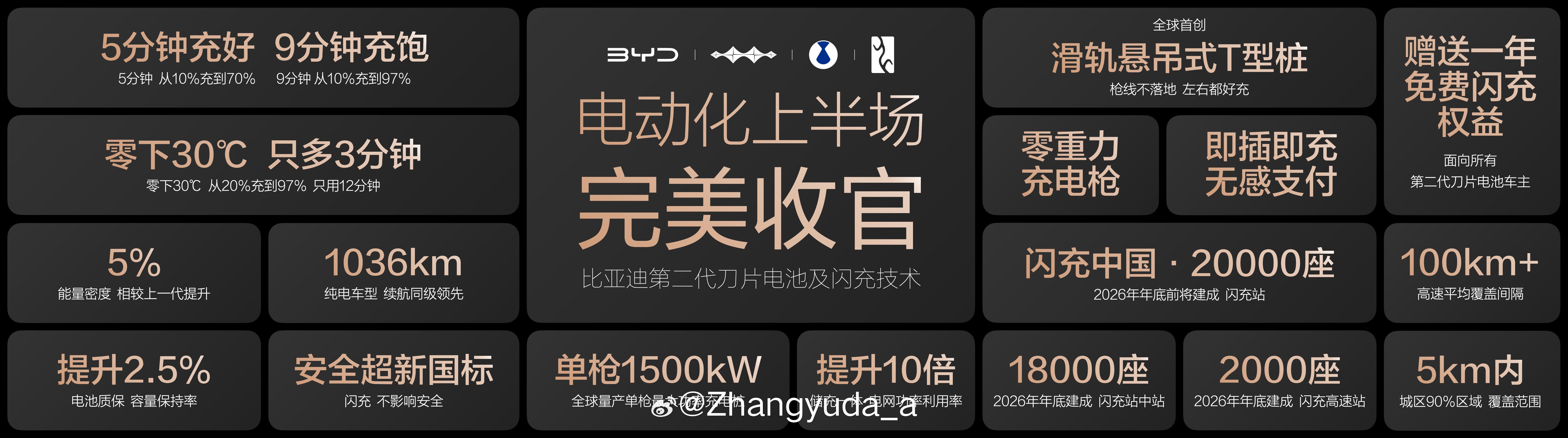 今天再说比亚迪公布的闪充站和闪充技术 ;:二代的闪充技术:常温充电,5分钟充好,9分钟充饱;低温充电,零下30度,只多3分钟”,常温充电情况下,从10%到70%,只用5分钟就能充好;从10%到97%,只用9分钟就能充饱;零下30度充电,从20%到97%只用12分钟,比常温只多3分钟。