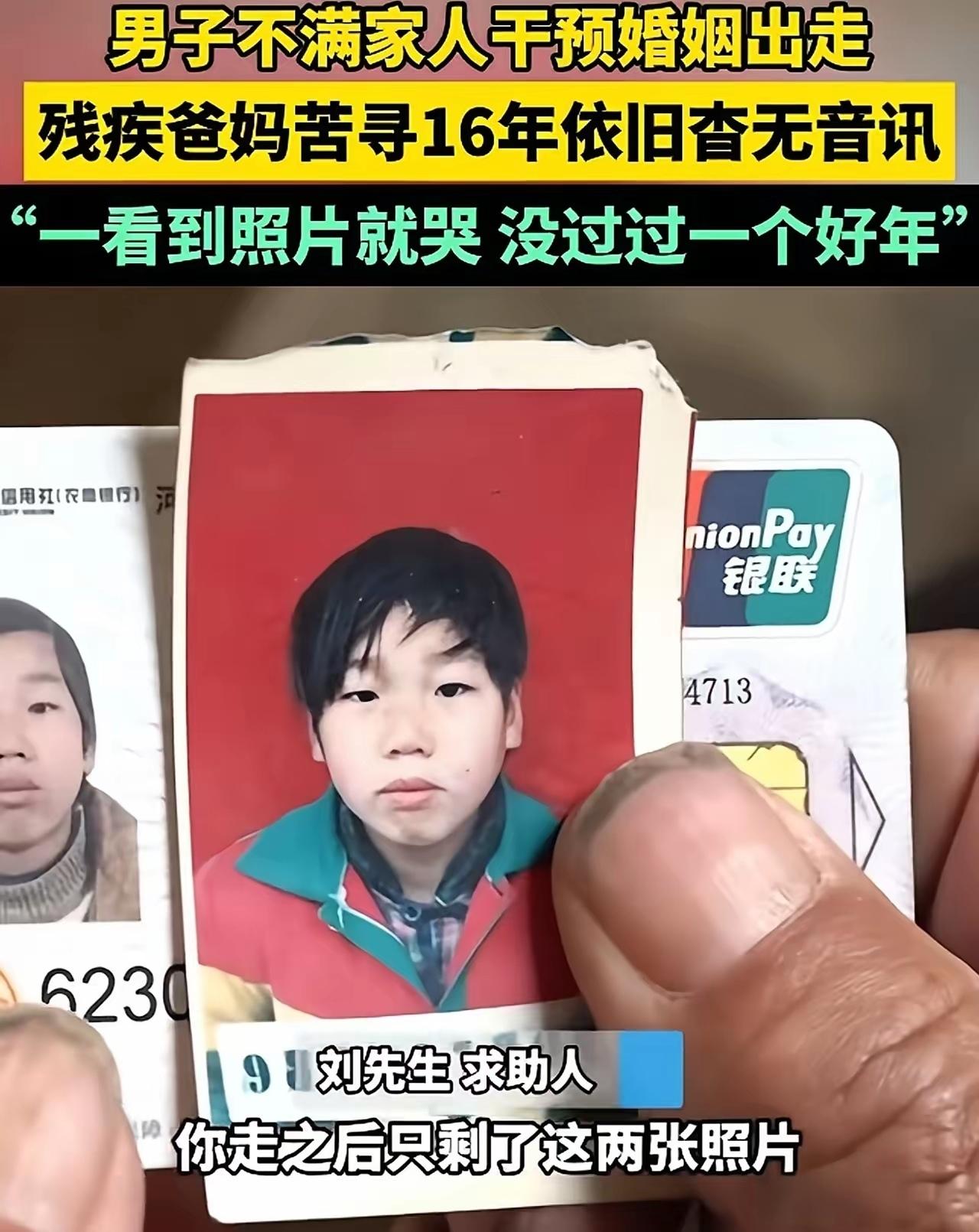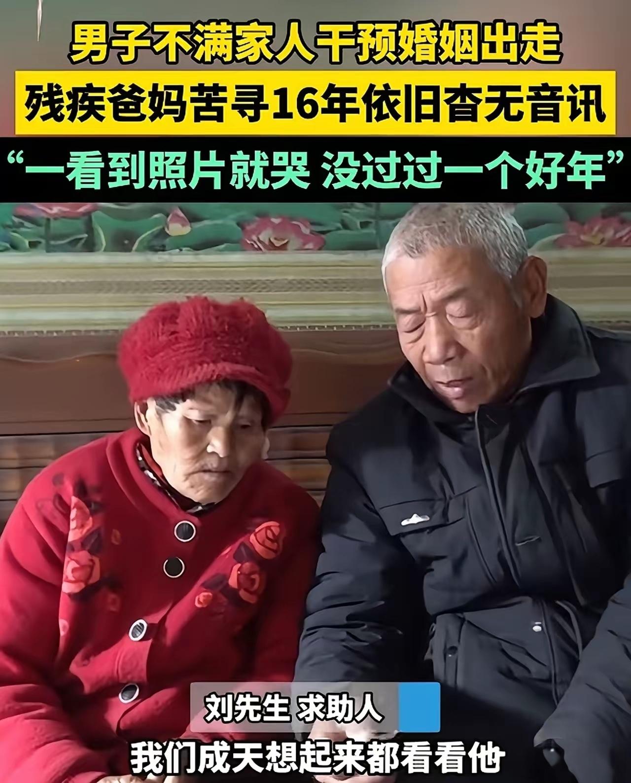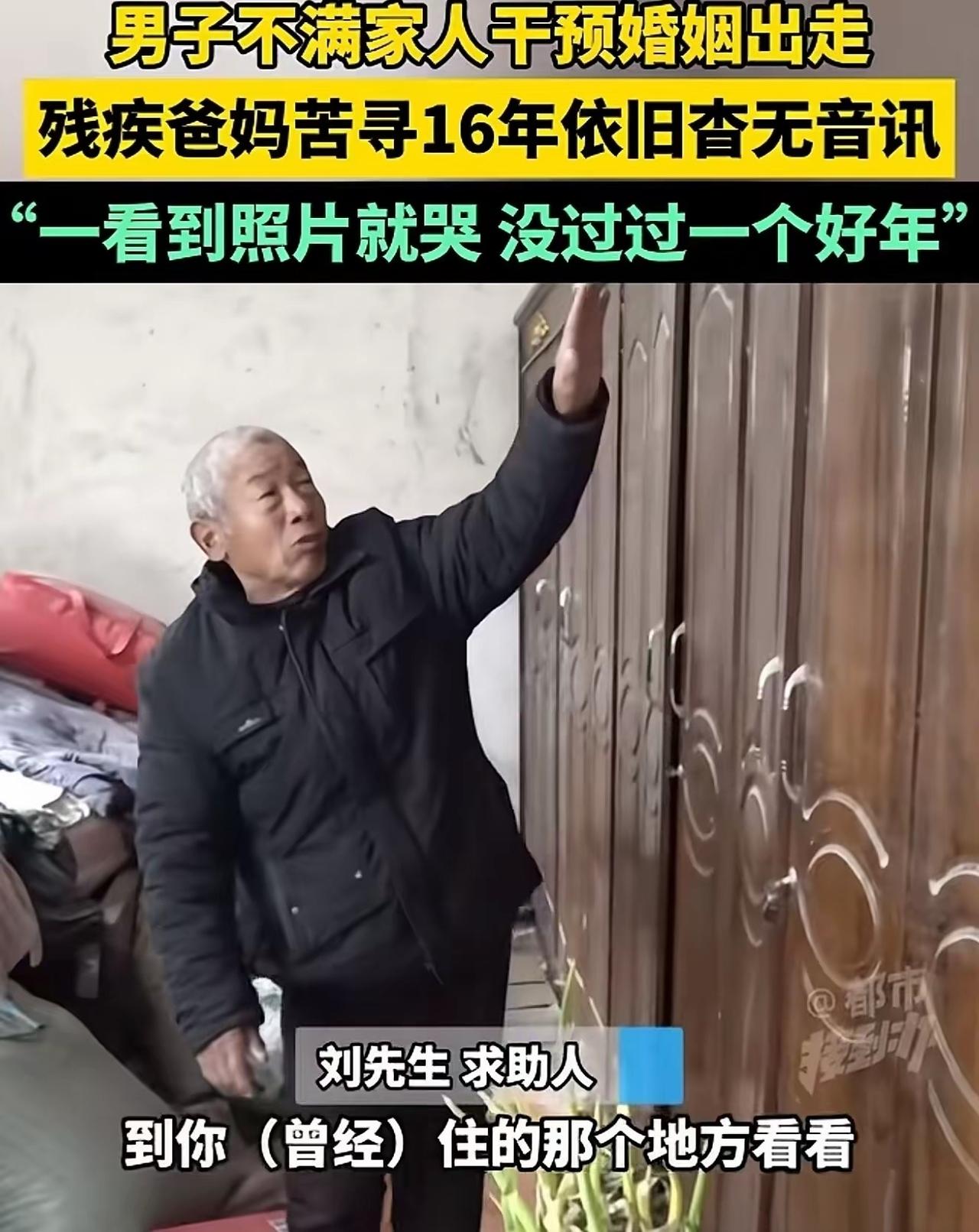 “早知今日,何必当初!”河南郑州,20岁小伙谈了个对象,父母嫌女方家太远,硬是把这段恋情给搅黄了,逼着儿子娶他们看中的本地姑娘。小伙一气之下离家出走,这一走就是16年,音讯全无。如今老两口60多岁,双双身患残疾,母亲思儿成疾,眼睛已经哭成半瞎。邻居说:16年了,老两口吃饭都含着眼泪,太惨了! 66岁的刘先生拖着残疾的腿,已经在寻子路上奔波了整整16年。 16年里,他和老伴没睡过一个安稳觉,没过一个舒心年,只为等儿子刘好举回家。 事情要从2010年说起。那年刘好举20岁,正是情窦初开的年纪,跟一位平顶山的姑娘好上了,两人感情处得不错,奔着结婚去的。 可刘先生两口子不乐意了。他们嫌姑娘家太远,不知根知底,以后有啥事儿连个照应的人都没有。正巧,当地有个知根知底的姑娘,老两口看中了,觉得这才是良配。 于是,他们强行把儿子的恋情给拆散了,逼着他按家里的意思结婚。 刘好举心里憋屈,跟父母大吵一架后,一气之下摔门而出。刘先生当时想,儿子就是出去散散心,过几天想通了自然会回来,毕竟父母都是为他好。 可谁也没想到,刘好举这一走,就是16年。从此杳无音讯,再没踏进过家门半步。 儿子走后,老两口的日子彻底变了味。 每到逢年过节,别人家热热闹闹团圆,他们家冷冷清清,老两口只能对着儿子的照片默默流泪。16年了,没过一个舒心的年。 当初给儿子准备结婚用的家具,还整整齐齐摆在屋里,如今落满了灰,结了蜘蛛网。 刘先生的老伴思儿心切,常年以泪洗面,眼睛都快哭瞎了。她每天一闲下来,就盯着儿子仅存的两张照片发呆——一张是孩子的相片,一张是社保卡。这是儿子离家后,留给家里仅有的念想。 邻居看了都心疼:“老两口吃饭的时候,经常吃着吃着就掉眼泪,太可怜了。” 刘先生也没放弃过寻找。他不顾自己残疾的腿,先后三次独自去上海。为啥去上海?因为儿子的发小说,刘好举在上海一家饭店做过后厨。 每一次,他都是根据公安局查到的身份信息赶过去,可每次都是满怀希望而去,满心失望而归。明明人就在那座城市,却始终没能见上一面。 他采过血、报过案、发过短信、打过电话,能想的办法全想了,可儿子就像石沉大海,一点回音都没有。 如今面对镜头,这位不善言辞的父亲满是悔恨:“要是时间能重来,我绝不会再拦他,一定会对他更好。”可世上哪有后悔药? 老两口现在最大的心愿,不是让儿子大富大贵,也不是要他弥补什么,只盼着他能回家看一眼。哪怕就回来一趟,让他们亲眼见一面,也就知足了。 这事传到网上后,评论区直接炸了锅。 有人说:16年不回家,心太狠了,再大的矛盾也隔不断血缘。 也有人不买账:现在想儿子了?现在后悔了?还不是因为老了、身体不行了,需要人照顾了!当年逼走儿子的时候,怎么不想想今天? 说实话,站在父母的角度,他们是真后悔了。16年的眼泪,哭瞎的眼睛,拖着残腿跑遍半个中国的寻找,这些骗不了人。 可站在儿子的角度,当年被最亲的人强行拆散恋情,那份委屈和愤怒,也真不是一句“为你好”就能抹平的。 这事儿你怎么看?儿子该不该回家?如果是你,你会原谅吗? (来源:根据媒体报道整理,人物均为化名)