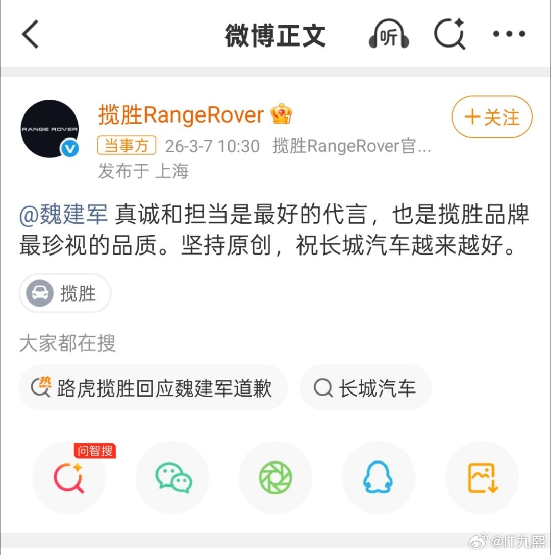 揽胜回应也大气,祝福加尊重原创,格局拉满。对比那些出事就狡辩的品牌,高下立判。有错就改、彼此体面,才是企业该有的样子。路虎揽胜回应魏建军道歉