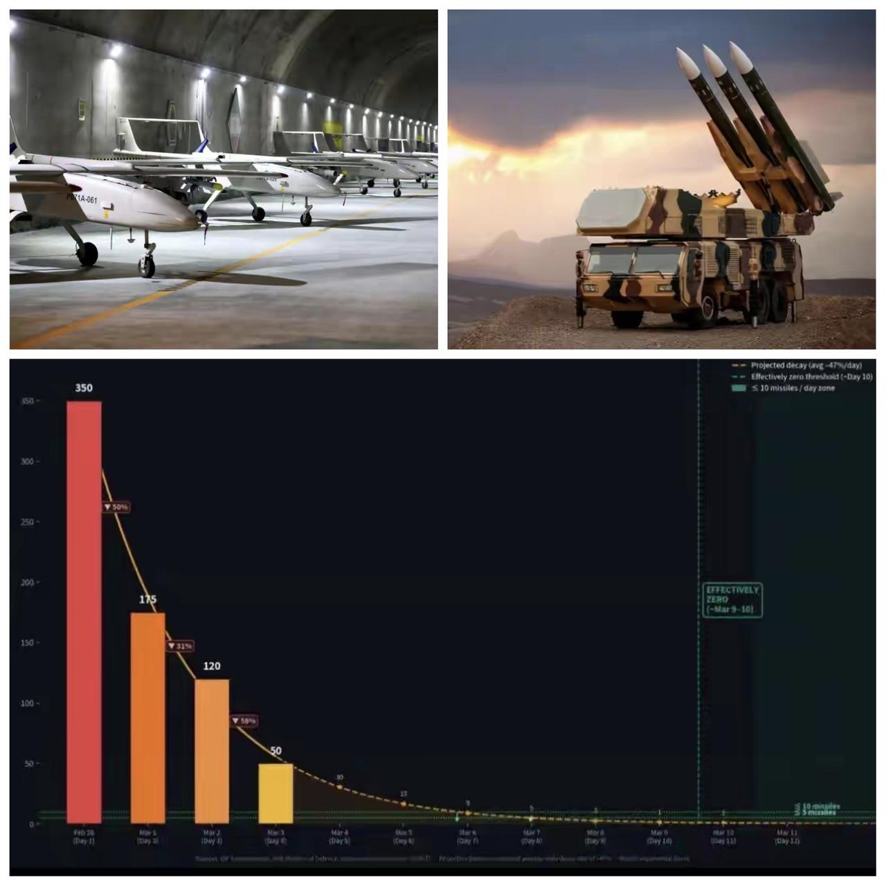 ✨伊朗“真实承诺4”第24轮军事行动✨ 🐼 从统计数据来看,伊朗在战争开始的前三天投入的火力最猛烈,能看出来是带着强烈的愤怒情绪。也给美国和以色列造成了未曾预料到毁伤。 🐼 从第四天开始每天发射的导弹和无人机就是几十枚了。一方面是美军基地也都被炸完了,一方面是以色列太小,军事目标也被炸得差不多了。伊朗的军事行动也变得精准而冷静。 🐼 伊朗总共库存导弹5000枚左右,无人机大约有8万架。这些都存在高山中挖的防空隧道了。美国和以色列就算用核武器也炸不到。伊朗已经做好了打持久战的准备。 🐼 贫道个人猜测,伊朗有这么好的表现,冷静且精准,大概率是有俄罗斯的军事专家已经秘密潜入伊朗,参与了伊朗军事行动的计划和指挥。美国和以色列这回麻烦大了。伊朗细水长流,坚持打一年都没问题。 ==== 2月28日:导弹 350枚,无人机 294架 3月01日:导弹 175枚,无人机 541架 3月02日:导弹 120枚,无人机 200架 3月03日:导弹 50枚,无人机 85架 3月04日:导弹 40枚,无人机 45架 3月05日:导弹 32枚,无人机 38架 3月06日:导弹 28枚,无人机 30架 3月07日(截至16时):导弹 18枚,无人机 12架 ==== 累计: 导弹:813枚 无人机:1245架 作者:龙须面🧐