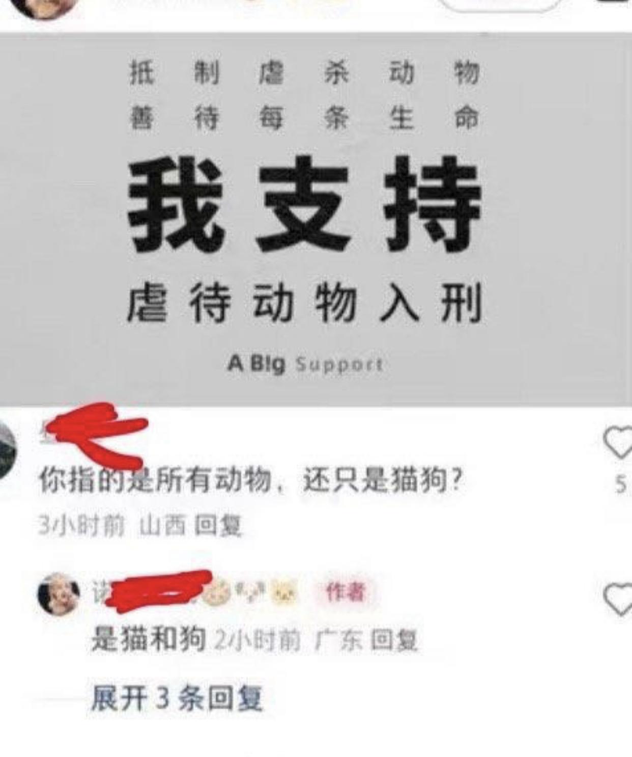 有人发文表态称,“我支持虐待动物入刑,但仅限猫和狗。