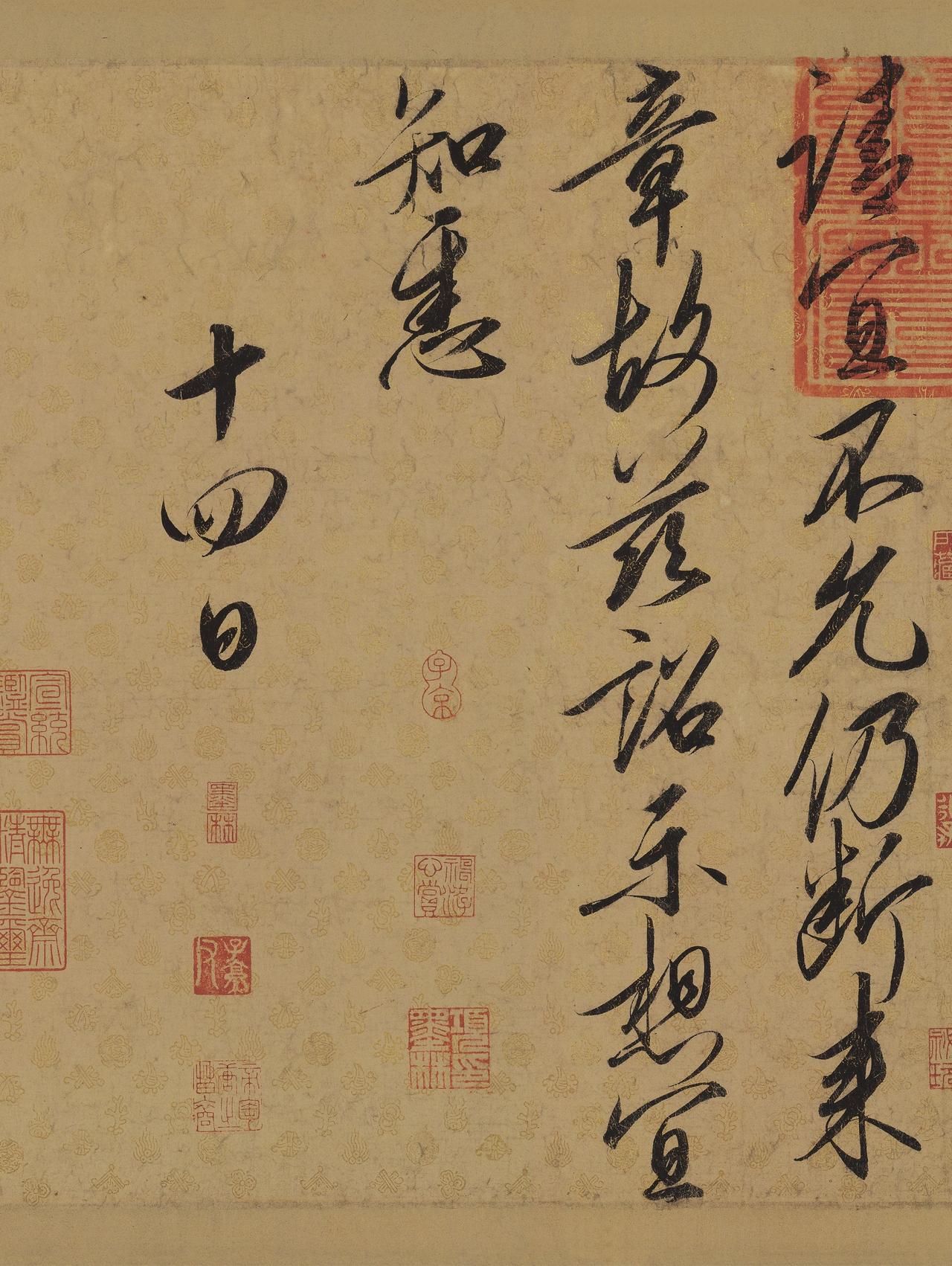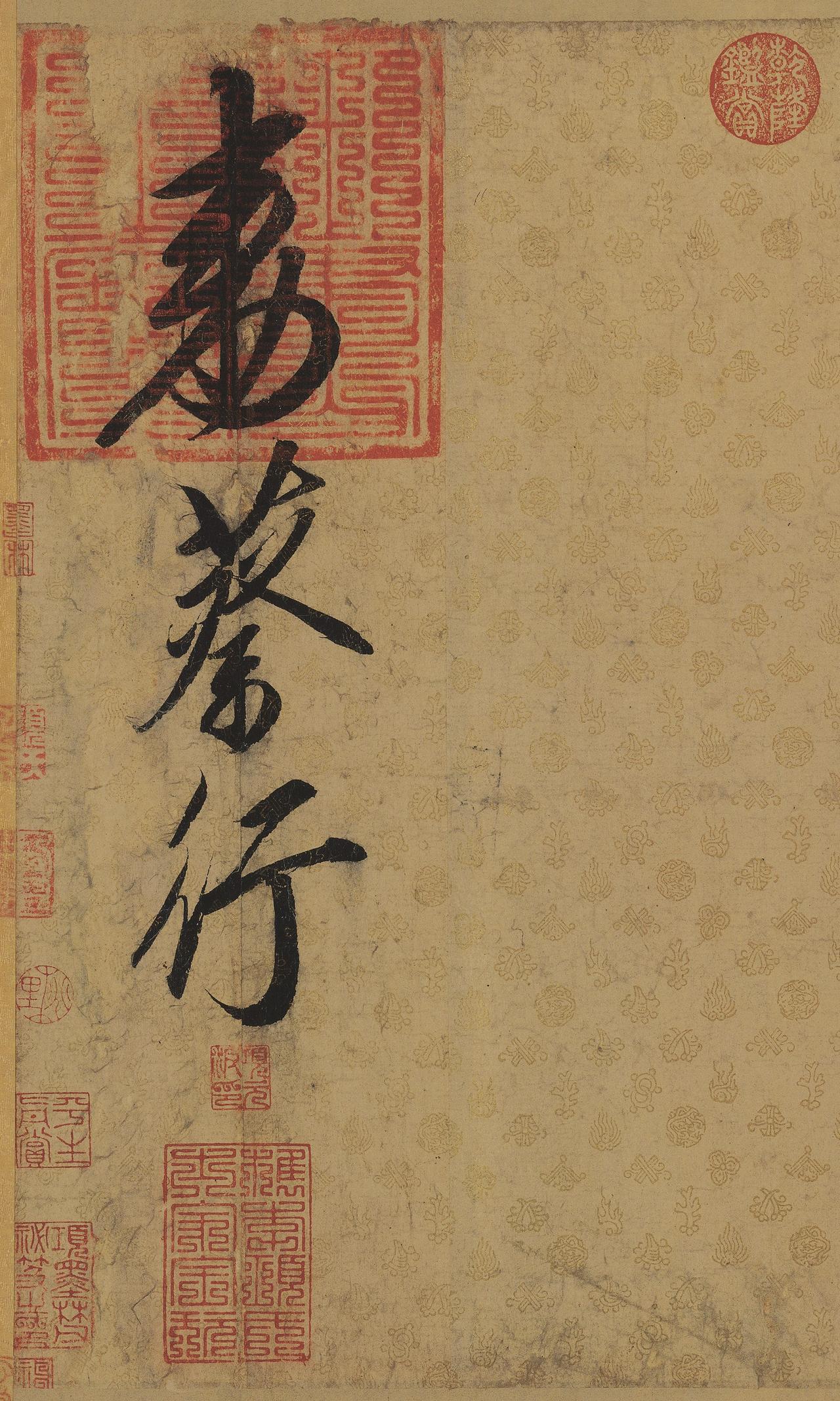 看看宋徽宗亲笔写的圣旨吧!“瘦金体”名不虚传,这种美真是难以言表! 宋徽宗赵佶虽为帝王,治国无方,却在书法艺术上造诣极高,《书蔡行敕卷》是其行书代表作,也是存世罕见的北宋帝王敕命墨迹,全卷纵35.5厘米、横214.6厘米,总计21行、127字,字径大小约6厘米,完成于宣和年间,此时正是宋徽宗书法风格完全成熟的时期。 它是宋徽宗驳回宠臣蔡行请辞的亲笔敕书,蔡行是奸臣蔡京的孙子,当时担任领殿中省一职,掌管宫廷衣食住行,职位显要且亲近帝王。蔡行因避嫌或谦逊,上疏请求辞去这一职务,宋徽宗便亲手写下此敕,予以慰留和勉励。 《书蔡行敕卷》给人以潇洒清健、飘藤荡柳之感,它有两大极为珍贵的特点,其一是它的书写材质——描金云龙纹笺纸,这种纸张工艺极为复杂,以优质皮纸为基底,经过染色、涂蜡、砑光等多道工序,再用泥金描绘云龙图案,色泽鲜艳、质地光亮,尽显宫廷的富丽堂皇。 这种描金云龙纹笺纸的工艺如今已经彻底失传,对技艺要求极高,纸面光滑如镜,直接下笔易使墨汁成珠,书写时需借助黏剂辅助才能成型,专供宫廷帝王使用,寻常官员和文人根本无法接触。 其二是笔法的精妙丰富,将“瘦金体”与行书巧妙融合。宋徽宗书写此作时,以中锋行笔为主,笔画细劲且富有弹性,每一笔都如刀剑般精准锐利,没有丝毫拖沓滞涩之感。兼具行书的流畅灵动、瘦金体的潇洒凌厉。 元代陶宗仪在《书史会要》中评价宋徽宗书法:“徽宗行草正书,笔势劲逸,初学薛稷,变其法度,自号瘦金书,意度天成,非可以形迹求也。” 《书蔡行敕卷》正是这句话的生动体现,它用笔严谨却不呆板,自然流畅却不随意,笔力深沉又不失灵巧,有文人的雅致韵味。 这幅作品曾被明代大收藏家项元汴误判为宋太宗赵光义所书,后来经现代书画鉴定家阎万章、杨仁恺等人考证,结合笔法、书风、钤印及历史文献,才确认其为宋徽宗真迹,如今藏于辽宁省博物馆,成为该馆的镇馆之宝之一。 对于书法爱好者而言,《书蔡行敕卷》是学习瘦金体与行书融合笔法的绝佳范本,其笔法精准、结构匀称,既有传统书法的法度,又有独特的个人风格。 我们将《书蔡行敕卷》进行了超高清1:1复制,精准还原原作的笔锋细节、墨色层次,便于大家临摹和欣赏。 宋徽宗赵佶行书《书蔡行敕卷》高清原大复制宣纸毛笔字帖长卷