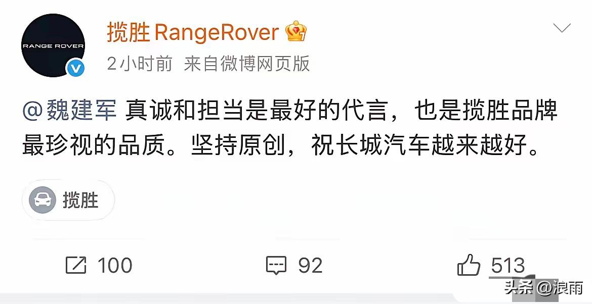 佩服。长城汽车海报抄袭路虎汽车一事,不到24小时完美解决。 这次抄袭事件可以说比海报设计更吸引眼球,事情发生后,大家都在观望下一步长城汽车会如何收场。 让人没想到的是,事情发生后,魏总没有过多的解释,没有抱怨,更没有推脱,他直接了当的说,责任在他,是他的问题,公开向路虎汽车道歉。 而他的真诚也得到了路虎汽车的回应,路虎汽车发文对魏建军的态度表示了肯定,并祝愿长城汽车越来越好。 这让我们看到了作为企业掌门人的魏建军是如何的化危机成为了机遇,最终让事件得到了圆满的结束。