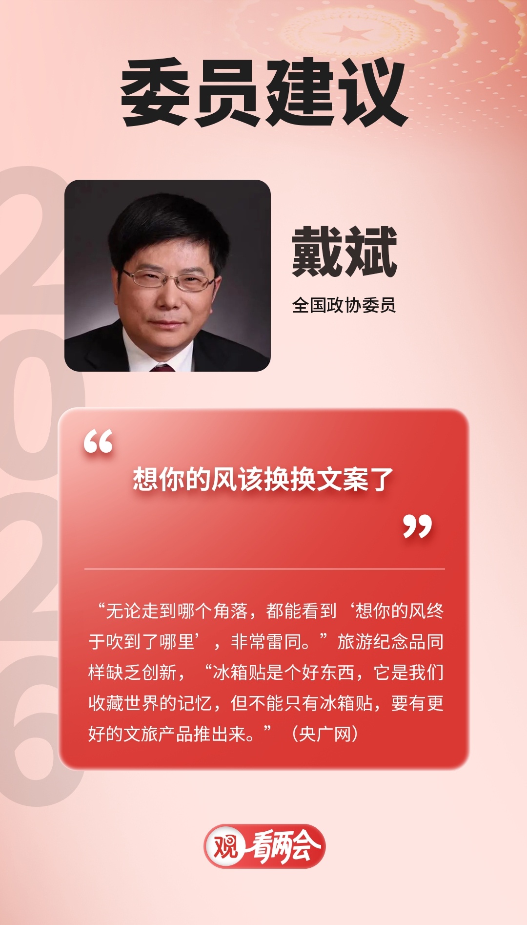 #委员称想你的风该换换文案了# 全国政协委员戴斌:“无论走到哪个角落,都能看到‘想你的风终于吹到了哪里’,非常雷同。”旅游纪念品同样缺乏创新,“冰箱贴是个好东西,它是我们收藏世界的记忆,但不能只有冰箱贴,要有更好的文旅产品推出来。”(央广网)