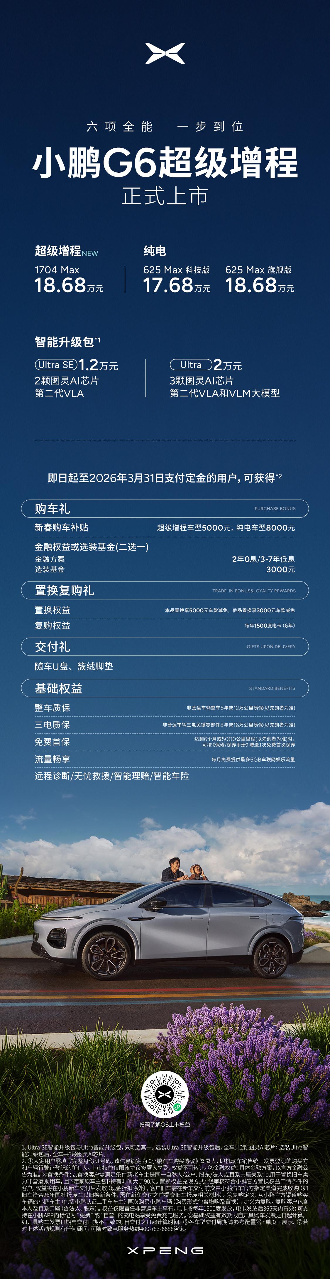 小鹏G6超级增程版发布: ·CLTC综合续航 1704km,CLTC纯电续航 430km,55.8kWh大电池+60L大油箱,全系标配800V+5C,12分钟最快补能314km,可加92号汽油。 ·ENC+RNC双源主动降噪,前双叉臂/后五连杆+太极液压衬套矩阵+智能可变阻尼减振器。 ·搭载第二代VLA,2250TOPS算力,85.6%得房率,前排1060mm、后排1021mm头部空间,635L后备箱可扩展至1740L。 ·180km/h高速爆胎稳行,130km/h AEB+AES,12000T前后一体式铝压铸车身 售价: 超级增程1704Max 18.68万元 纯电625Max科技版17.68万元 纯电625Max旗舰版18.68万元