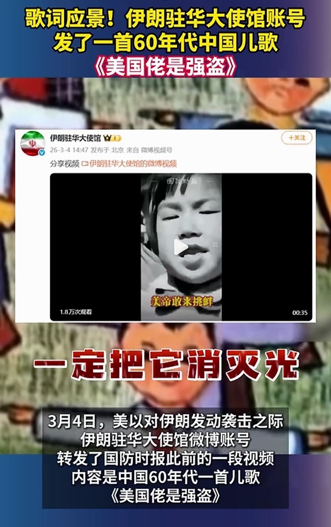 伊朗大使馆发出中国60年代儿歌《美国佬是强盗》,这么多年过去了,美国一直没有变。 歌词是这么说的: 美国佬,是强盗; 脸上笑嘻嘻,背后挂大刀。 见了好东西,什么都想要; 要不到,他就抢。 霸了土地占了房, 杀人放火样样干。 他的野心比天大, 想拖住那地球往家里搬。 这首儿歌创作于20世纪60年代初,是冷战背景下的一首反帝爱国儿歌。 令人感慨的是,这首儿歌放到今天仍然不过时,因为美国始终是那副德行,从来没有变过。