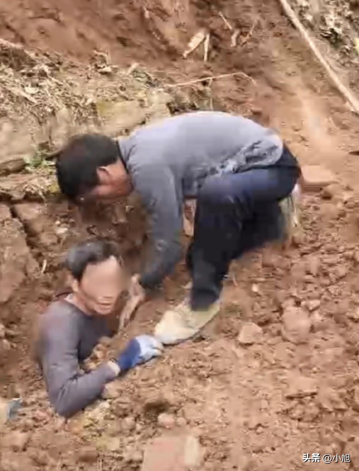 陕西旬阳关口镇泥沟村,正月十五那天,60岁的郭师傅寻思着儿女都返岗上班了,家里清静,就抡起锄头想把自家院坝地基再加固加固。谁想到这一锄头下去,刨出个天大的事。 他早年盖房那会儿的回填土,大概2个立方,看着结实其实早酥了。正挖着呢,头顶那面土墙轰一下就塌下来,郭师傅整个人就跟栽葱似的,直直被埋进土里,最后就露个脑壳在外面,连喊救命都费劲。 也是他命不该绝。59岁的李先生那天正好带着儿子到隔壁走亲戚,正跟亲家唠嗑呢,猛听见外头鬼哭狼嚎喊救人。李先生撂下茶杯就跑,到那一看,心里咯噔一下——那面土坡切得跟刀削过似的,差不多90度笔直,土质松松垮垮,随时可能二次塌方。 李先生干过市政工程,挖过排水沟铺过管道,见过世面。他先没急着上手刨,而是让人赶紧找几根粗木头,死死顶在郭师傅身子两侧,把上面要垮的土给撑住。然后才蹲下来,跟亲家两个人先用手把郭师傅胸口的土扒开,让他能喘上气。 周围邻居听到动静都跑来了,男女老少凑了十几个人。有人拿来铁铲小锄头,但不敢使劲用,怕伤着人,多数时候还是跪在那用手刨。有个细节挺动人——一直有人用手掌护着郭师傅的脸和后脑勺,怕碎土掉下来眯眼睛砸脑袋。 挖了一个多钟头,郭师傅腰那块露出来了。有人急眼了,上手就想把人往外拽。李先生当场吼住:别动!他观察半天,发现郭师傅在土里身子是歪的,斜着埋进去的,这要是硬拽出来,腰和腿非得废了不可。 后来李先生改了个法子,让大伙在郭师傅跟前挖出一条一尺来宽、一米来长的斜坡道,人趴在那够着往里刨。就这么着,整整折腾了90分钟,才把郭师傅整个从土里“起”出来。 你说邪不邪门?郭师傅上医院从头到脚查一遍,愣是一点伤没有。救完人,邻居们拍拍土就要走,他老伴拉着非要留人喝茶,没一个肯喝的。李先生把救援视频发网上,郭师傅儿子在评论区留言,说改天一定要请救命恩人喝顿酒。 当地政府听说这事,想给李先生他们评个见义勇为。结果这几个人全给推了,说邻里邻居的,谁碰上不伸把手?这点小事还值当表彰? 有意思的是,关口镇去年10月确实遭过一波洪灾,全镇塌了140多处路,那时候邻里之间就是互相帮着清淤抢收 。这回郭师傅出事,那拨人又站出来了。农村这种人情味,平时看不见摸不着,真到节骨眼上,那就是救命的东西。 不过话说回来,郭师傅挖的那面土坡接近90度,泥土又湿又松,不出事才怪。他自己也后怕,说等把院坝收拾利索了,打算请村镇干部来帮忙规划规划,今年在家搞点养殖,不出去打工了。 这事你们怎么看?现在农村留守老人多,自己干这种危险活的不在少数,万一出事,靠的也就是隔壁邻居搭把手。你们村有这样的好人吗?