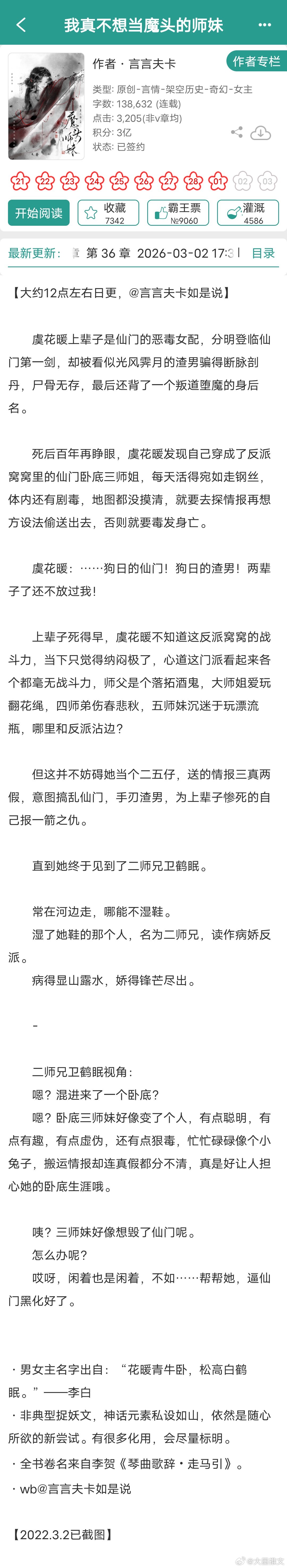 1《我真不想当魔头的师妹》言言夫卡2《天官诡闻录》八月薇妮3《山里有个王子病》施岁4《别再惊动他》含胭