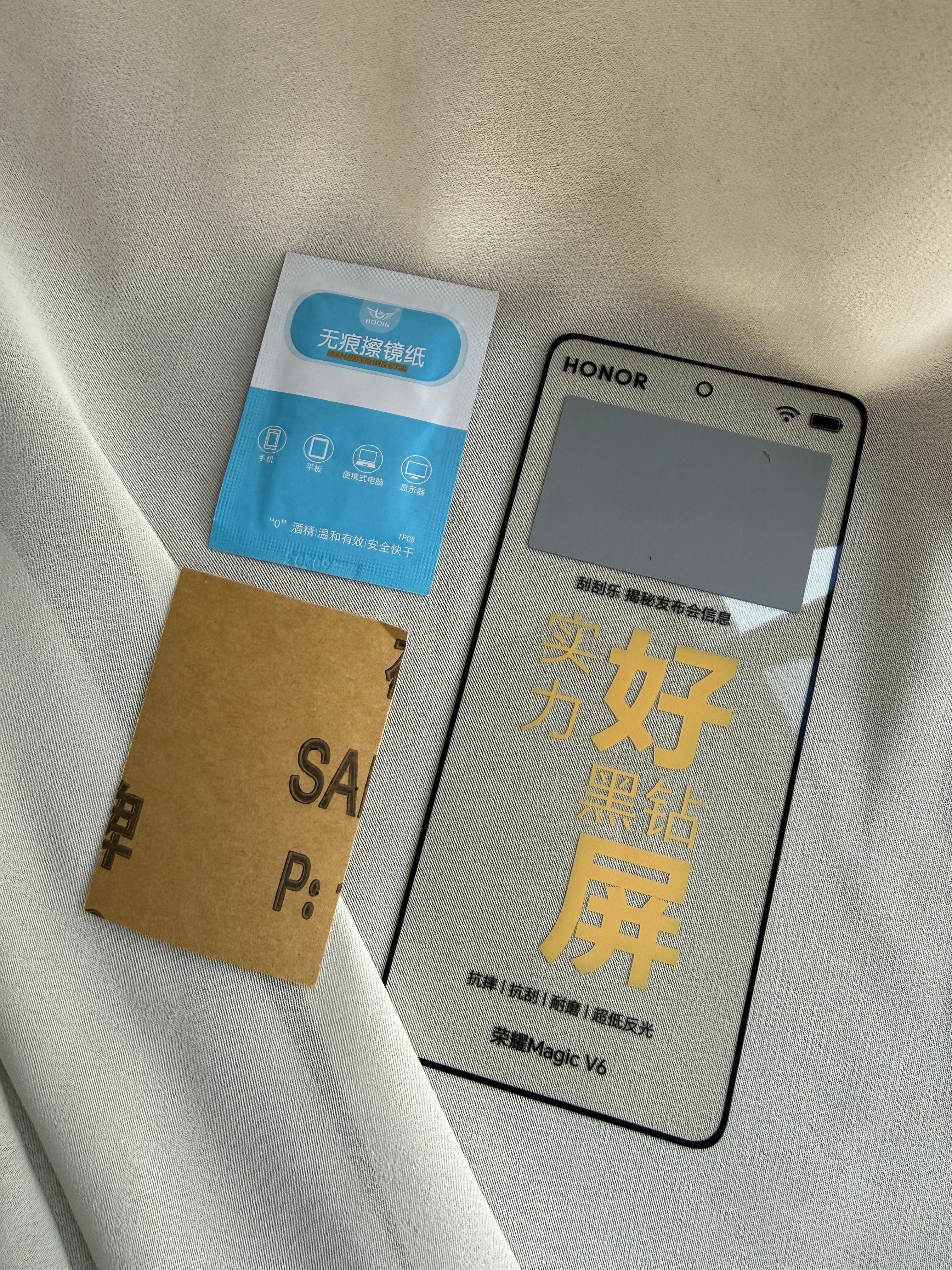 收到了荣耀Magic V6正式的邀请函一块至臻黑钻屏!用砂纸无论多大力刮都没有划痕又试了下我手机贴的钢化膜,坚硬程度完全比不了