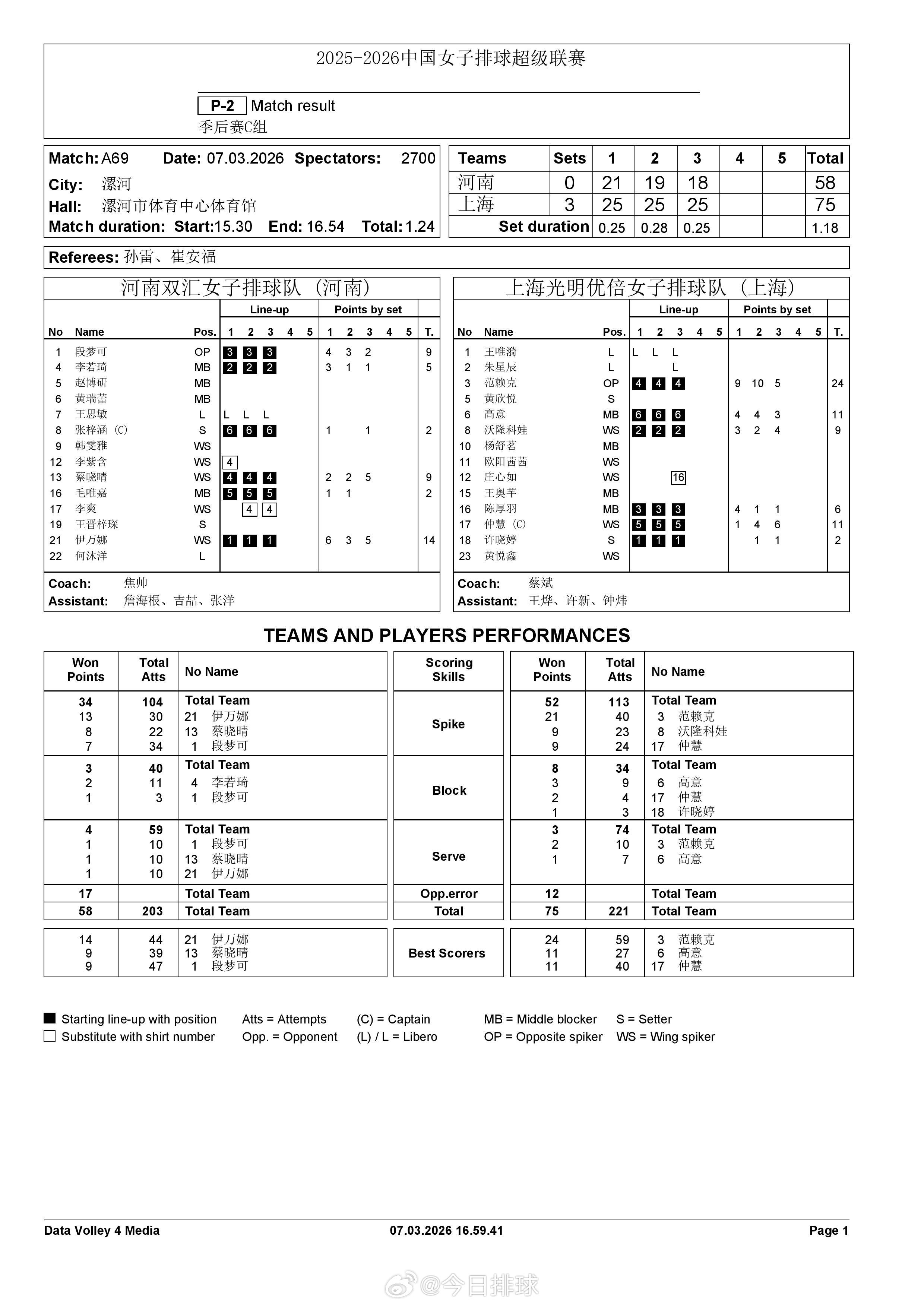 【中国女排超级联赛 河南0-3上海】3月7日下午,A级季后赛总第18轮,C组的河南双汇在主场以0-3(21-25, 19-25, 18-25)不敌上海光明优倍。伊万娜14分,段梦可、蔡晓晴各9分;范赖克24分,仲慧、高意各11分,沃伦科娃9分,陈厚羽6分。
