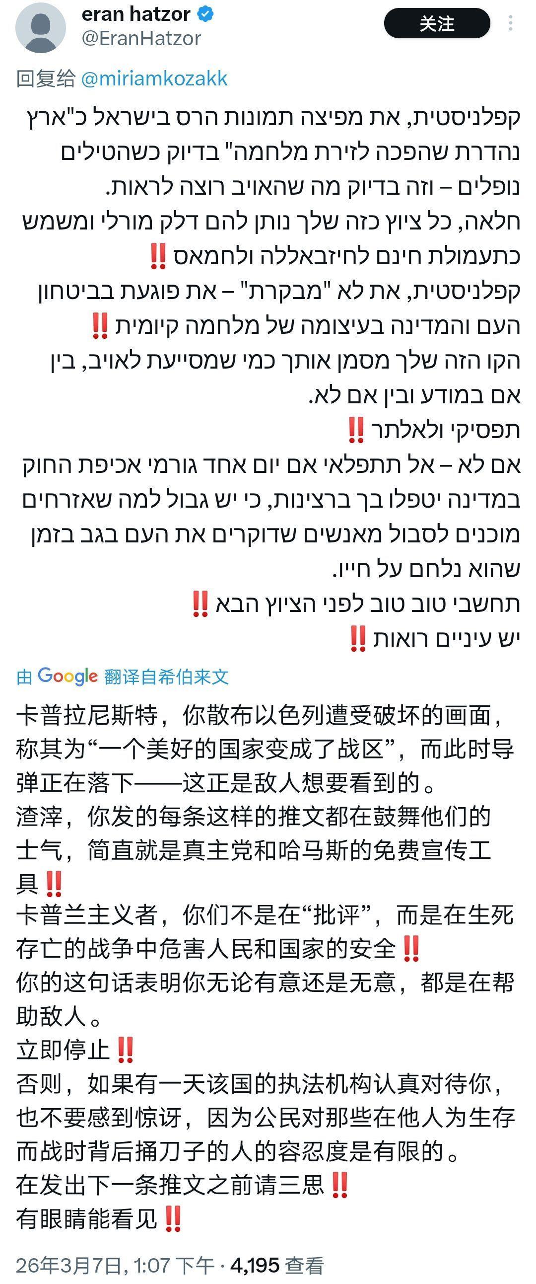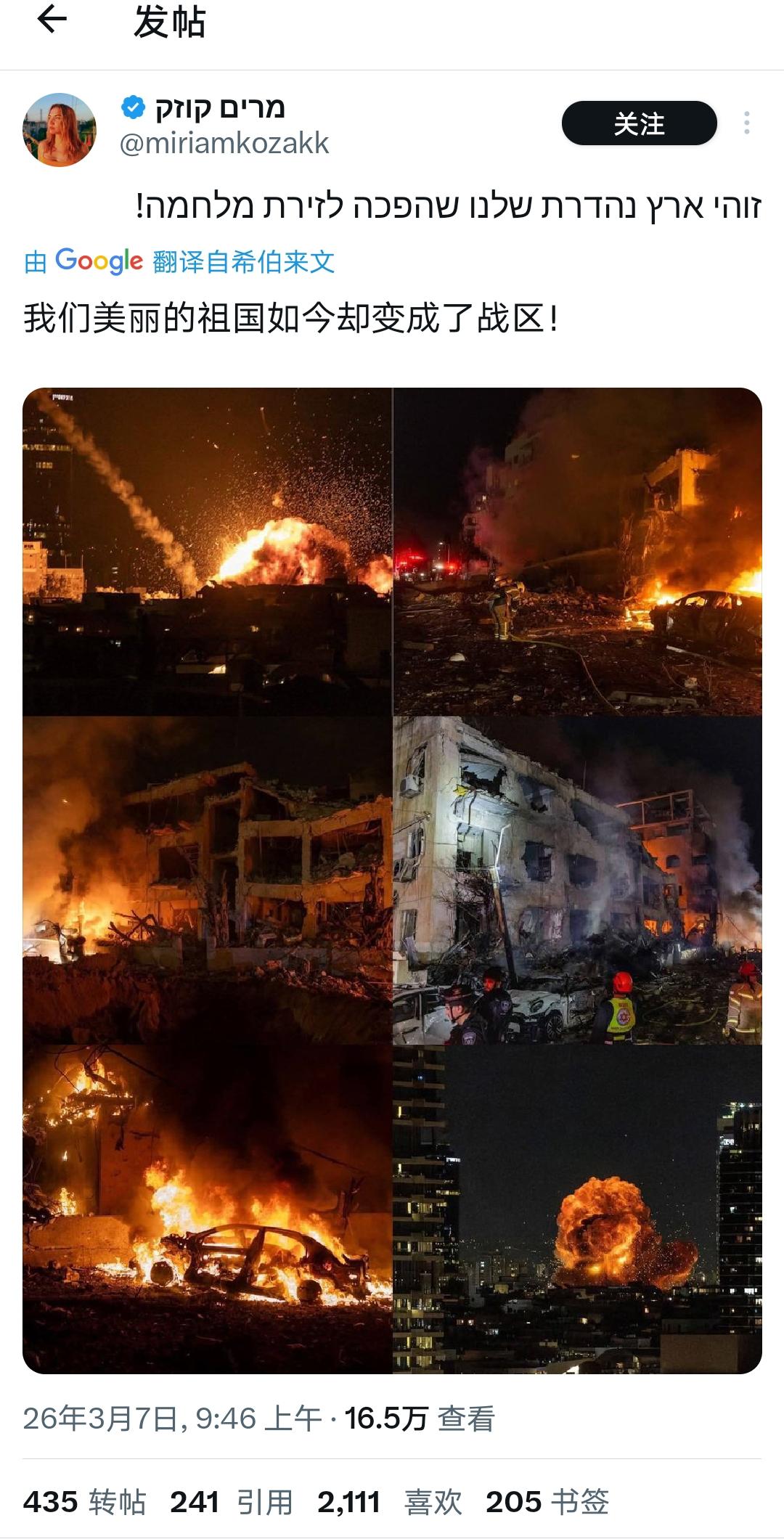 以色列网友连环爆锤当局谎言! 以色列官方天天吹 “AI 辅助决策 + 多层防空”,说拦截率 90%+,本土几乎 “零损伤”。 结果呢? 以色列网友自己发的照片,把城市被炸、街头大火的惨状全晒出来了,配文直接戳破:“我们美丽的祖国如今却变成了战区!” 更讽刺的是,另一个以色列网友跳出来骂她 “通敌”,说她是 “哈马斯宣传工具”,还威胁要让执法机构收拾她。 这是在吵架吗??是实锤以色列当局在撒谎吧! 当官方的 “胜利叙事” 和民众的 “战区体验” 彻底脱节,连说真话都要被打成叛徒,这个国家的防空神话,早就碎得渣都不剩了! 多说无益,有图有真相! Source: X