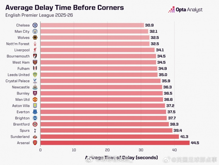 2025/26赛季英超各队角球前平均延误时间(从少到多排序)↓