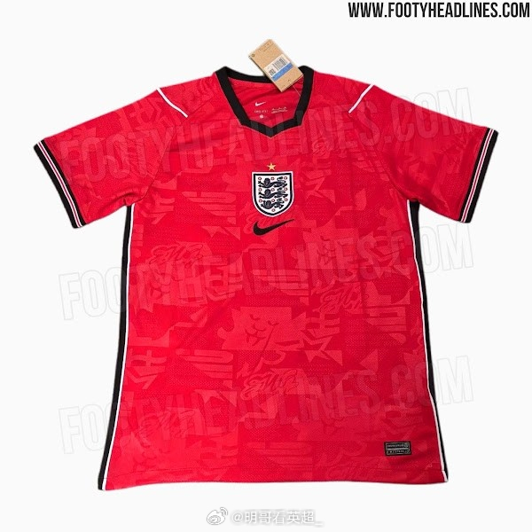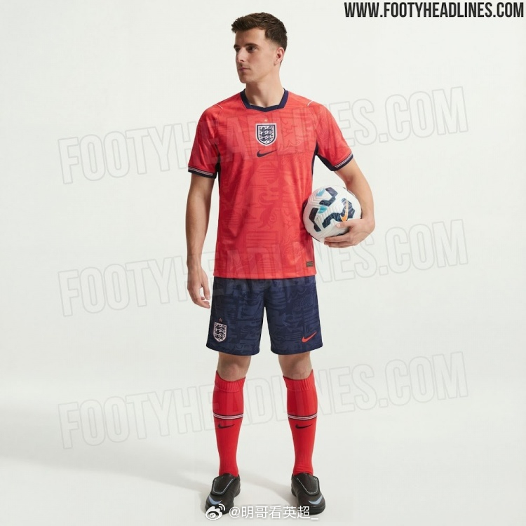 英格兰2026世界杯客场球衣谍照:红色为底,搭配白色和海军蓝